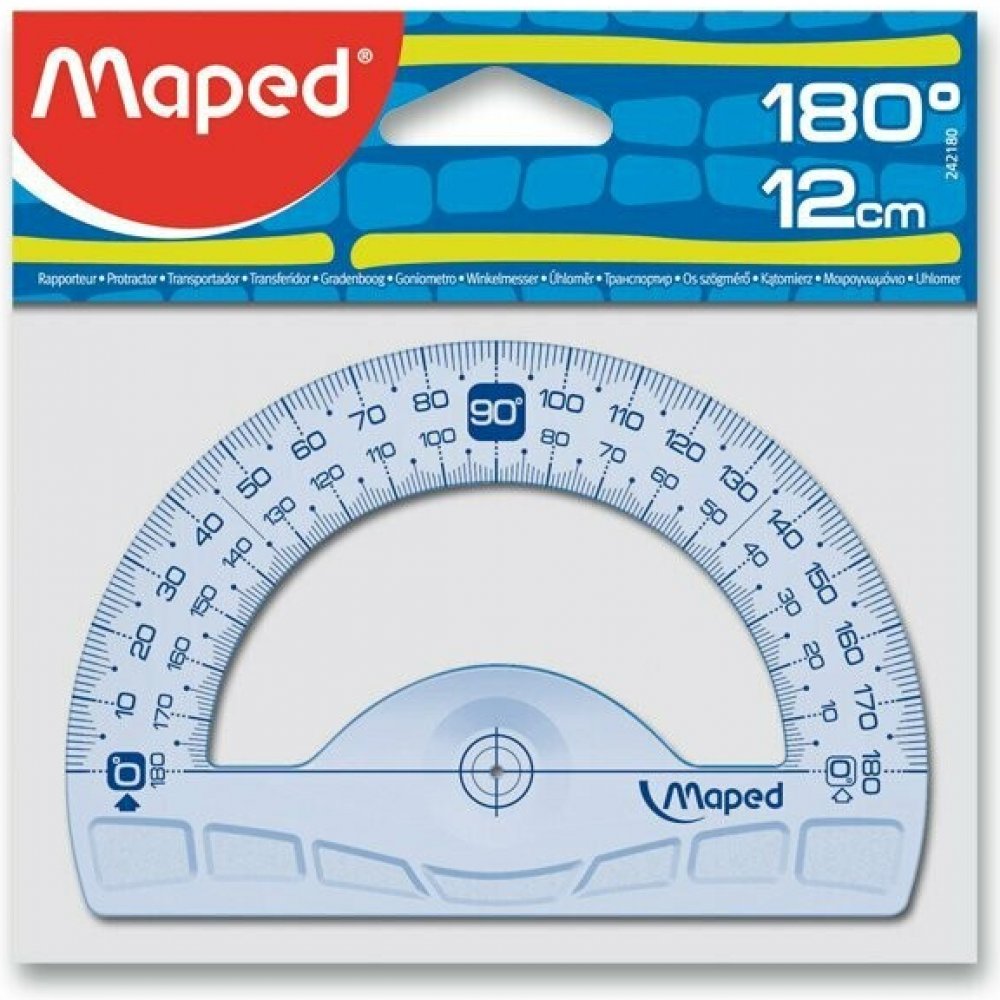 Úhloměr čirý 180 stupňů Maped Geometri Úhloměr 180° se základnou 12 cm. Vysoce kvalitní značení, stupnice jsou natištěny za použití UV inkoustu a jsou maximálně odolné. Cena za 1 kus
