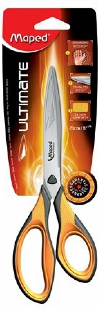 Ergonomické nůžky Maped Ultimate, velikost 21 cm. Patentovaná technologie přizpůsobení rukojeti, nýt ve tvaru trojhranu. Broušená nerezová ocel s reliéfním zdobením. Asymetrické rukojeti pro pohodlné a přesné stříhání.