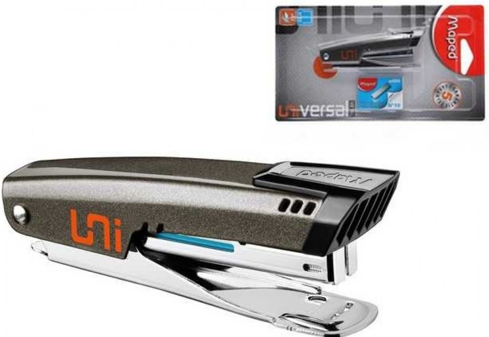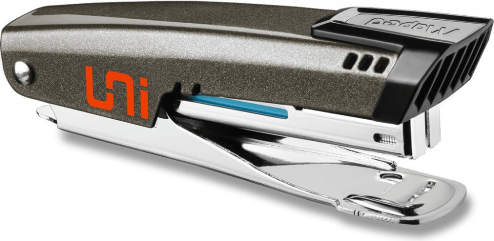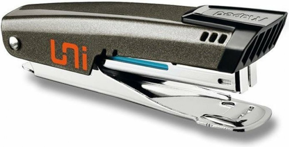 Praktická kapesní malá kovová sešívačka se zabudovaným rozešívačem.