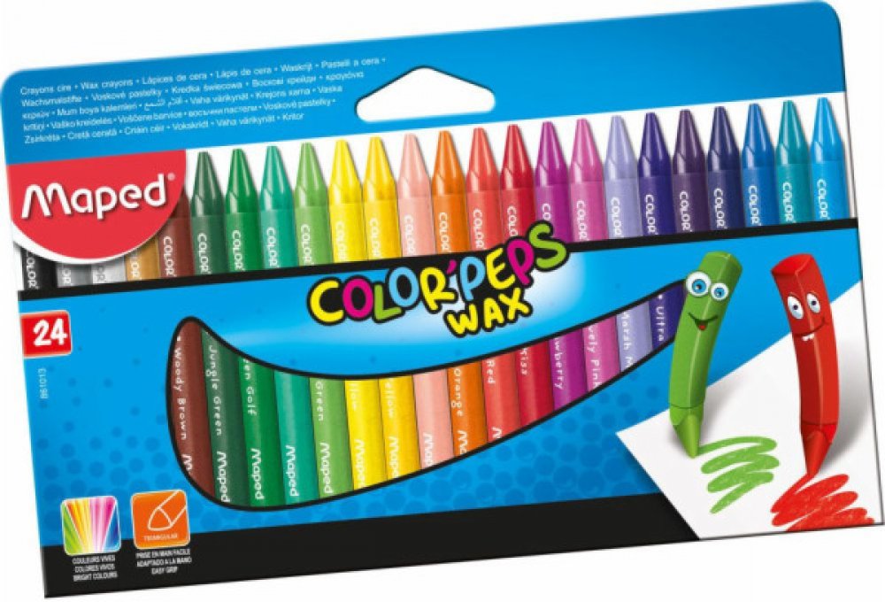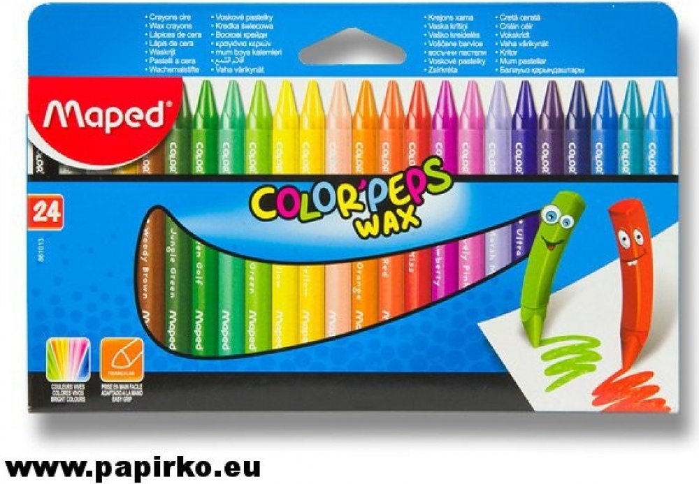 Colorpeps pastelky na svíčky 24 barev MAPEDMAPED ➡️ Školní a psací potřeby / Pastelky ✔️Svíčkové pastelky v papírovém obalu proti ušpinění rukou, trojúhelníkový průřez, intenzivní barvy, kvalitní vosk pro jemné kreslení, netoxické - souladu se všemi předpisy pro výrobky určené dětem. 24 barev. JS 1 balení. ➡️✔️Věková kategorie: 4+Vydavatel/producent: MapedRok vydání: kartonový obal,195x125 mm Další informace. Colorpeps pastelky na svíčky 24 barev MAPED MAPED Číslo: 3154148610137, ATE-419014. Počet dní do odeslání:3. Hmotnost: 0,255 kg.➡️ Svíticí tužky Colorpeps 24 barev MAPED je synonymem nejvyšší kvality a spolehlivosti, vytvořeno pro náročné uživatele.➡️ Moderní řešení a precizní zpracování odlišují výrobek od konkurence.➡️ Každý detail byl pečlivě navržen tak, aby bylo zajištěno maximální pohodlí a trvanlivost.➡️ Výběrem pastelky na svíčky Colorpeps 24 barev MAPED sázíte na osvědčené řešení, které splní vaše očekávání Voskové pastelky COLOR'PEPS WAX, kartonová krabice- trojúhelníkový tvar pro lepší uchopení- s papírovým obalem pro čisté ruce- zářivé barvy- Délka: 90 mmbalení 24 kusů: v různých barvách olivově zelená, světle červená, fialová, tmavě modrá, barva kůže, bílá + barvy balení 18 kusů Souprava 24 kusů ergonomických voskovek MAPED Color'Peps. Voskovky mají jasné barvy a měkkou odolnou tuhu. Trojhranný tvar usnadňuje dětem jejich držení. Narozdíl od běžných voskových pastelek nešpiní dětem při kreslení ruce a pro pohodlnější držení je jejich tělo potaženo papírem. Délka voskovky: cca 9 cm ideální pro malé dětské ruce, trojúhelníkový tvar pro bezpečné uchopení, s ochranným papírovým obalem, různé barvy, v kartonu -861311 Voskovky s trojhranným tělem. Jasné barvy, měkký vosk. Nezanechávají stopy na rukou, tělo je kryto papírem. Průměr voskovky 9 mm Pro děti od 3 let Jasné barvy, s papírovým obalem, aby se neušpinily ruce. V kartonovém pouzdře.