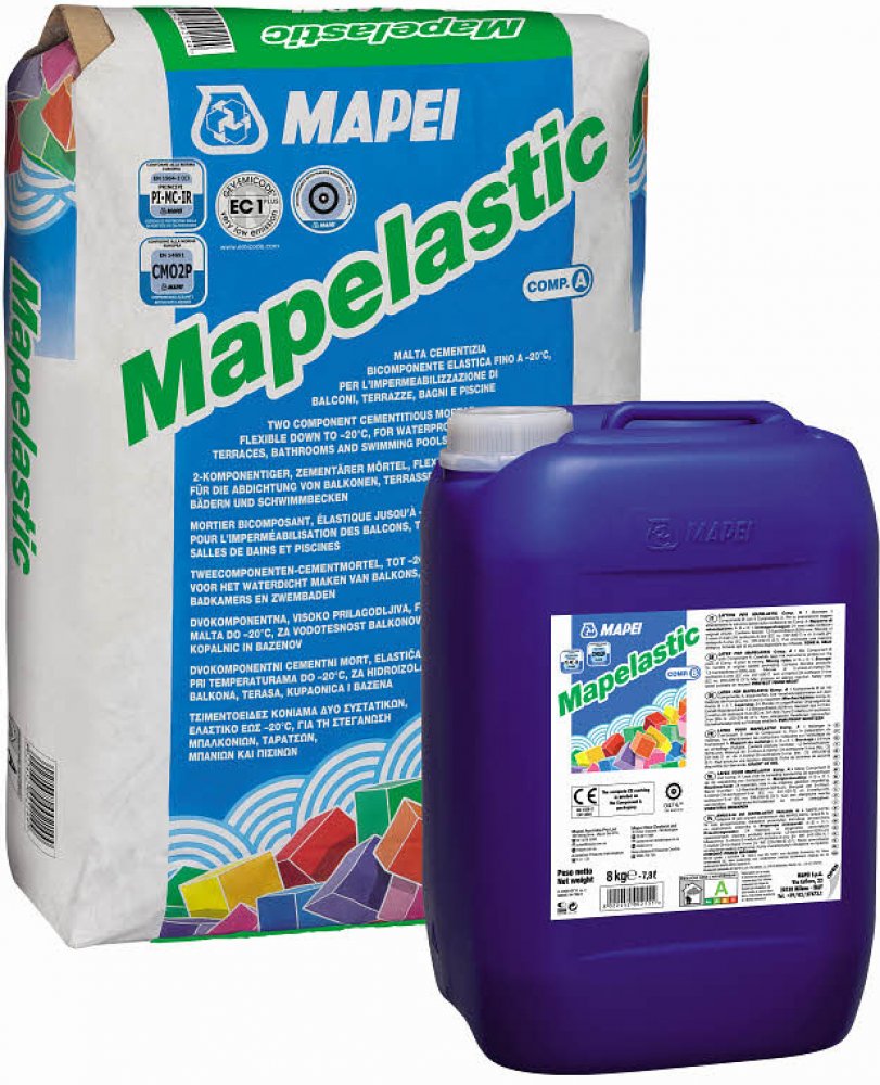 MAPEI MAPELASTIC se používá jako ochrana a vodotěsné ošetření betonových povrchů, omítek a cementových potěrů.