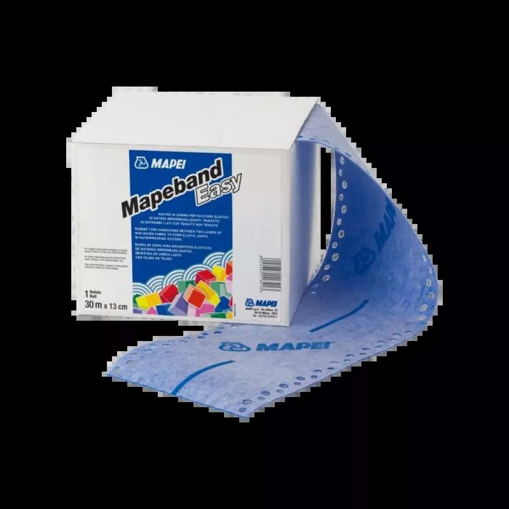 Mapeband Easy je 13 cm široký, gumový pás, oboustranně povrstvený netkanou textilií, pro vložení do hydroizolačních hmot Mapei, pro chemicky vysoce odolné vodotěsné a elastické překlenutí dilatačních a spojovacích spár pod keramickými obklady a dlažbou, k utěsnění prostupů potrubí a odtoků a přechodů mezi sousedními stěnami a stěnou a podlahou.