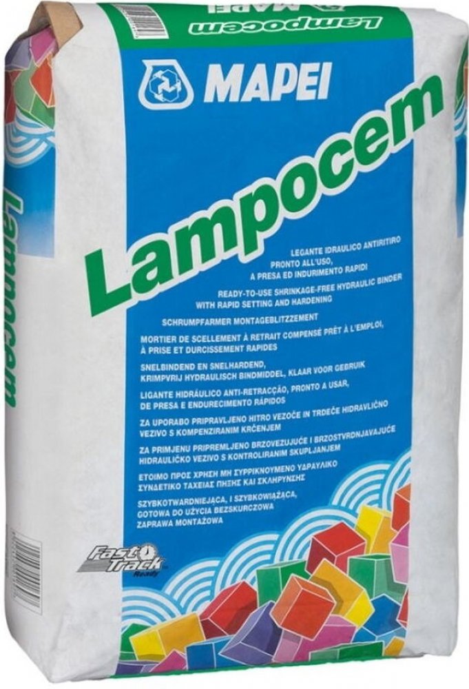 Mapei Lampocem je hydraulická pojivová směs s velmi rychlým průběhem tuhnutí a tvrdnutí bez vzniku smršťovacích trhlin. Použití Rychlá fixace všeho druhu na vertikálních i horizontálních betonových nebo zděných podkladech. Vlastnosti maximální rozměr kameniva: < 0,1 mm, mísicí poměr směsi: 100 dílů LAMPOCEMU s 20-21 díly vody, skladování: 12 měsíců, aplikace zednickou lžící nebo stěrkou. spotřeba: 1,8 kg/dm3 vyplňované dutiny. Výhody zpracovatelnost směsi: cca 1 min. (při + 23°C) Balení v 25kg pytlech, 48 ks/paleta: 1200 kg.