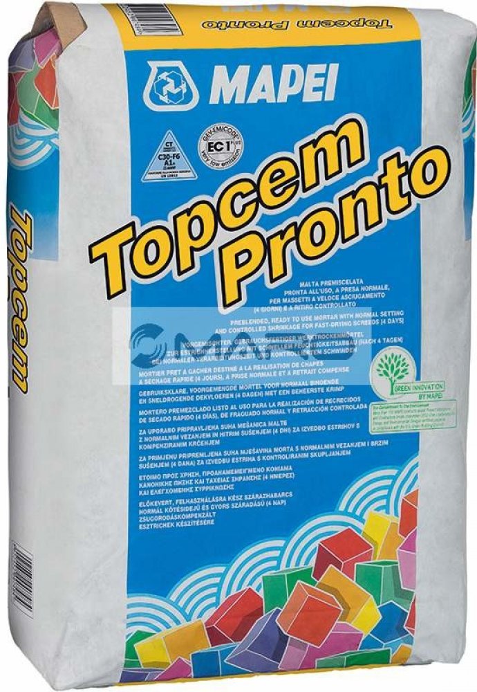 Mapei TopCem Pronto předem namíchaná malta připravená k použití pro potěry s rychlým úbytkem vlhkosti (4 dny), normální dobou zpracovatelnosti a kontrolovaným smrštěním • je připraven k přímému použití a musí se smíchat pouze s vodou • pro potěry ve vnitřním i venkovním prostředí • spotřeba: 18-20 kg/m2 na cm tloušťky, v závislosti na míře zhuštění • balení: pytle 25 kg
