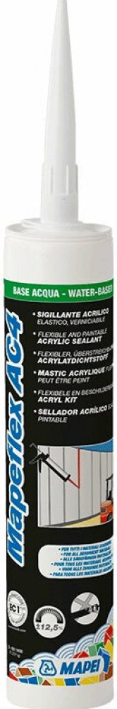 MAPEI Mapeflex AC4 akrylový těsnící tmel je jednosložkový akrylový těsnící tmel ve vodní disperzi. Používá se k těsnění spár mezi betonovými panely, pokud předpokládané pohyby ve spáře nepřesáhnou 10 % její šířky, těsnění spár mezi prefabrikáty, sádrokartonovými panely a dřevěnými deskami, těsnění komponentů z betonu, omítkových směsí, zdiva, azbestocementu, dřeva nebo přírodního kamene, vzduchotě...