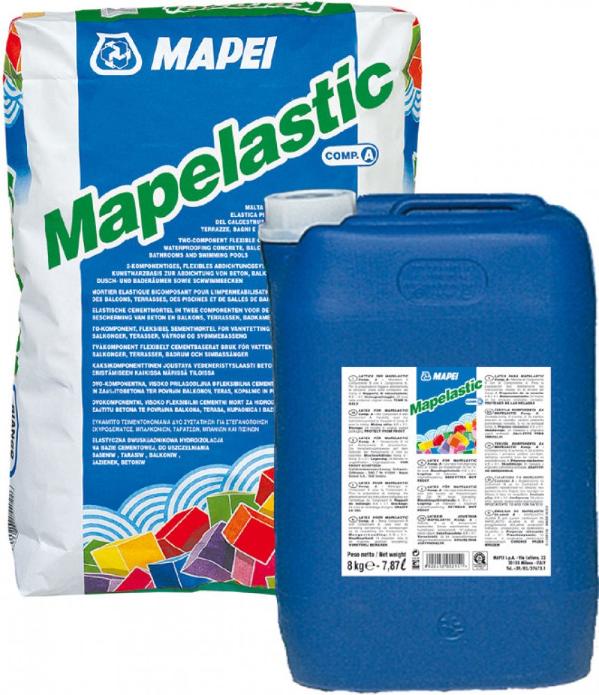 Mapelastic je pružná dvousložková cementová stěrka k hydroizolaci betonových povrchů, balkonů, teras, koupelen a bazénů.