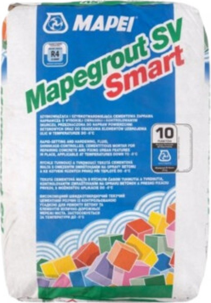 Tekutá kompenzační malta R4 pro opravy betonu a kotvení prvků s rychlým tuhnutím. Mapegrout SV Smart je vysoce tekutá cementová malta s kompenzovaným smršťováním a velmi rychlým tuhnutím, která je určena pro opravy betonu a kotvení prvků, jako jsou poklopy, kanalizační mříže nebo jiné silniční a městské konstrukce. Je klasifikována podle normy EN 1504-3 jako malta třídy R4, což znamená vysokou pevnost a strukturální spolehlivost. Maximální velikost kameniva je 2,0 mm a po smíchání s 12,5–13,5 díly vody získá velmi tekutou konzistenci. Směs lze aplikovat i při teplotách od –5 °C do +35 °C. Doba zpracovatelnosti (pot life) při +23 °C je přibližně 15 minut, po 20 minutách nastává počátek tuhnutí a po dalších normovaných podmínkách až vytvoření pevné struktury. Po 28 dnech dosahuje malta tlakovou pevnost až 60–65 MPa v závislosti na teplotě. Modul pružnosti po 28 dnech je cca 27 GPa a přilnavost k betonu je po 28 dnech vyšší než 3 MPa. Tato malta má nízký obsah chloridových iontů (≤ 0,05 %) a po vytvrzení vykazuje nízkou kapilární absorpci (