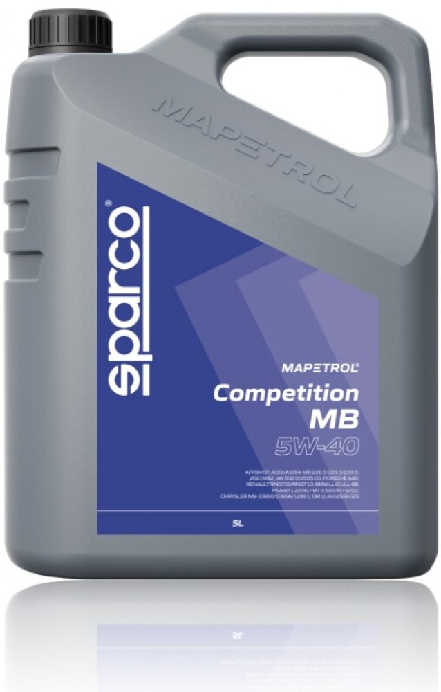 Mapetrol Sparco Competition MB 5W-40: Plně syntetický motorový olej pro benzínové a dieselové motory automobilů, vyjma těch, které mají filtr pevných částic (DPF). Nabízí vynikající ochranu motoru, delší intervaly mezi výměnami oleje, čistotu a dobrou viskozitu při nízkých teplotách.
