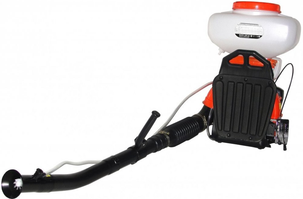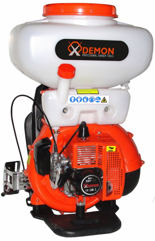 dvoutaktní motor, objemná nádrž 20 l, rozsah postřiku 11 m, nízká hmotnost 12 kg, ergonomický design, vhodný na kapaliny i granulované chemikálie