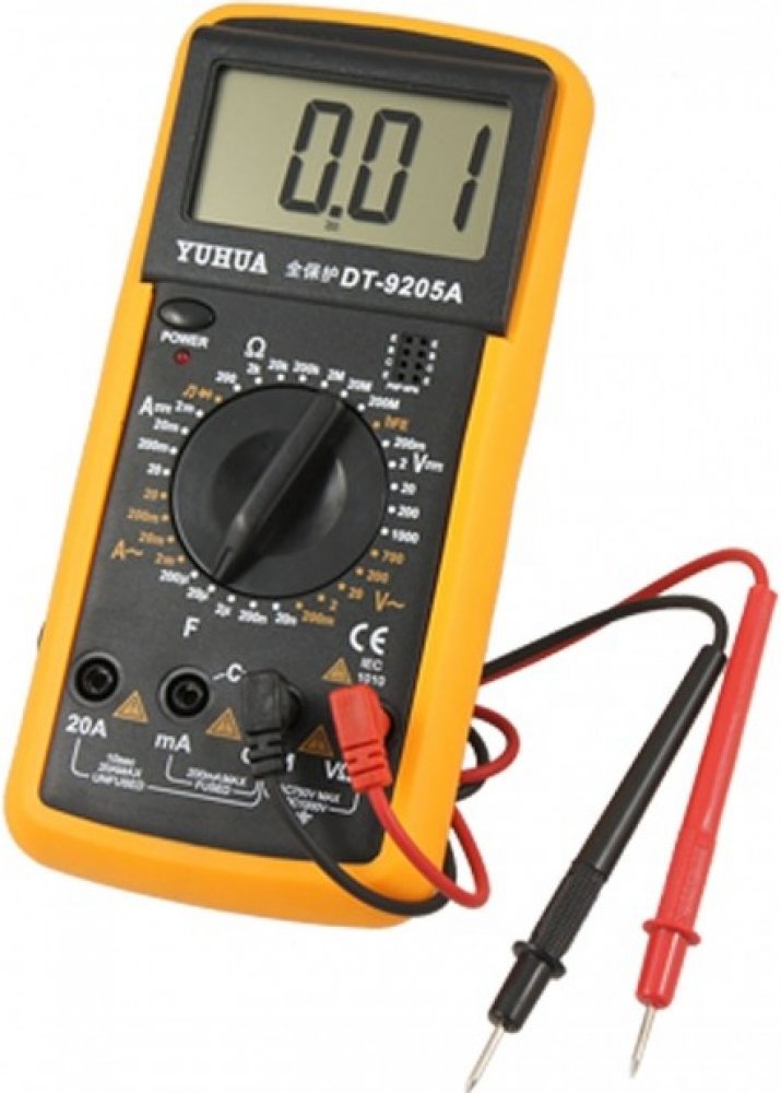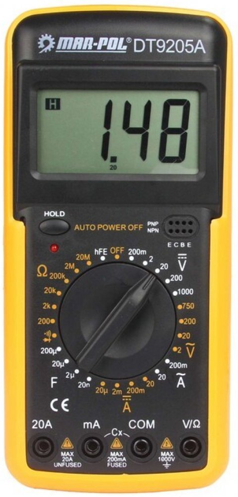 Digitální multimetr DT-9205AVhodné pro domácí použití, ale i pro profesionály. Optická signalizace poruchy. Indikátor slabé baterie. Nastavitelný stojan umožňuje snadno číst výsledky z LCD. Opatřen ochrannou gumou proti nárazu. Technické údaje:DCV napětí: 200 mV - 1000 V (+/- 0,5% +1)ACV napětí: 20 mV - 700 V (+/- 1,2% +3)ACA napětí: 200 mA - 20 (+/- 0,8% +1)DCA proud: 2 mA - 20 (+ / - 1% + 2)Ohm - 200/2K/20k/200K/2M/20M/200M (+/- 0,8% +2)SPP: 2 NF - 200 UFHOLD na poslední měření: anoPolarita indikace: anoTest tranzistorů: anoTest diod: anoNapájení: 9 V baterieVelikost displeje: 27 x 60 mmMaximální čtení: 1999Rozměry: 191 x 89 x 35 mmHmotnost: 280 g Obsah balení:Digitální multimetrSada testovacích vodičůGumový kryt6F22 9 V baterieNávod na použití [PDF, 0.38 MB]Návod na použití [PDF, 0.35 MB]
