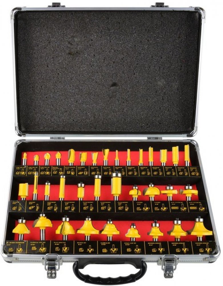 Frézy, nože na horní frézku 35 ks 8 mm35-dílná sada profilových fréz vyrobených z uhlíkové oceli pro horní frézy s upínací kleštinou 8 mm. Sada obsahuje 21 kusů ložiskových fréz a 14 bezložiskových. Sada je uložena v praktickém kovovém kufru.