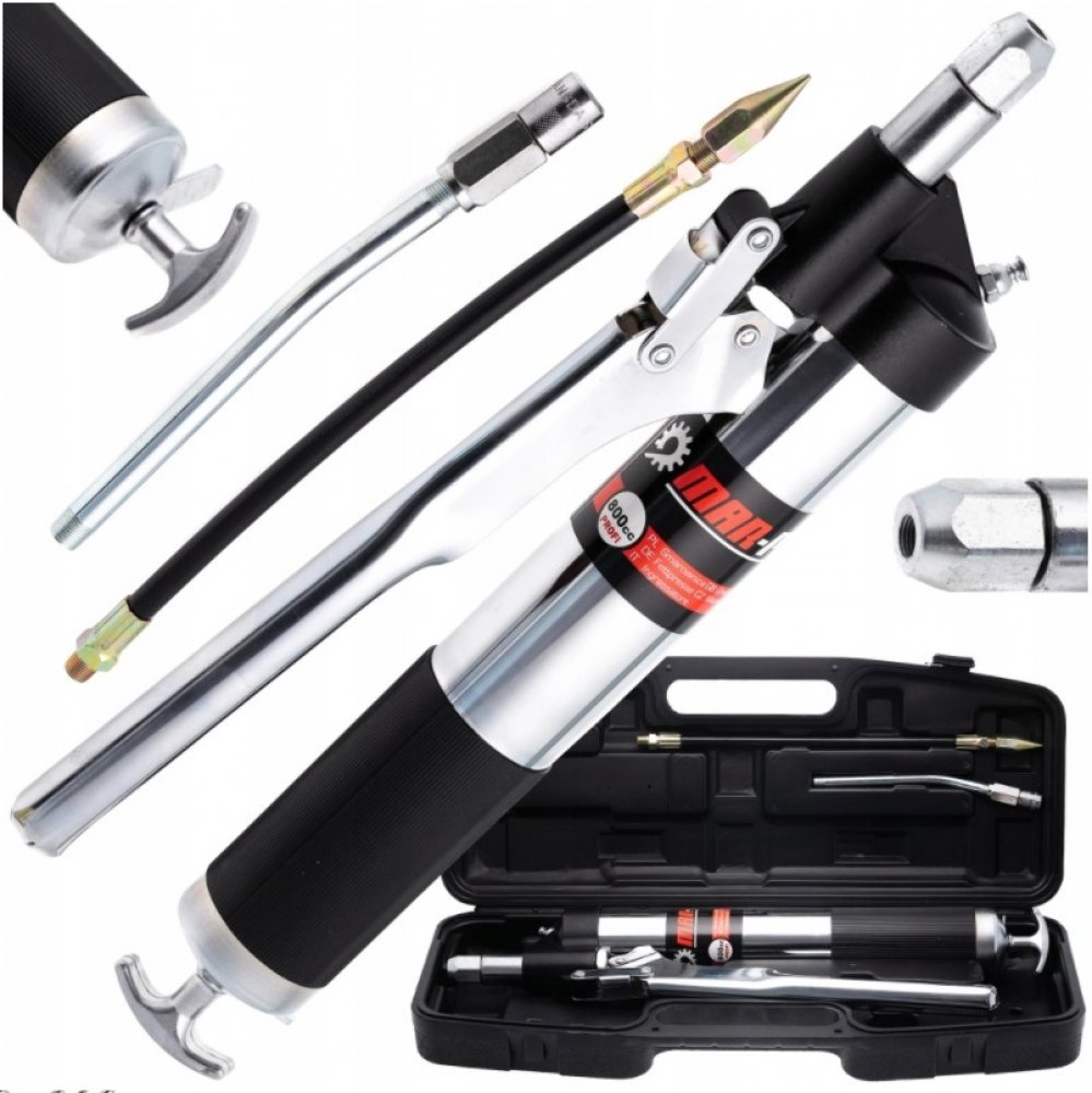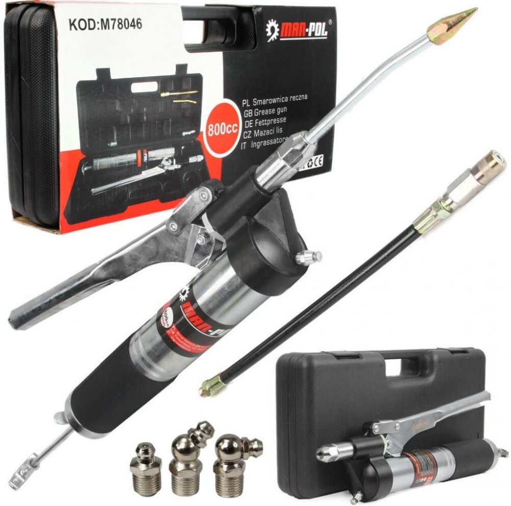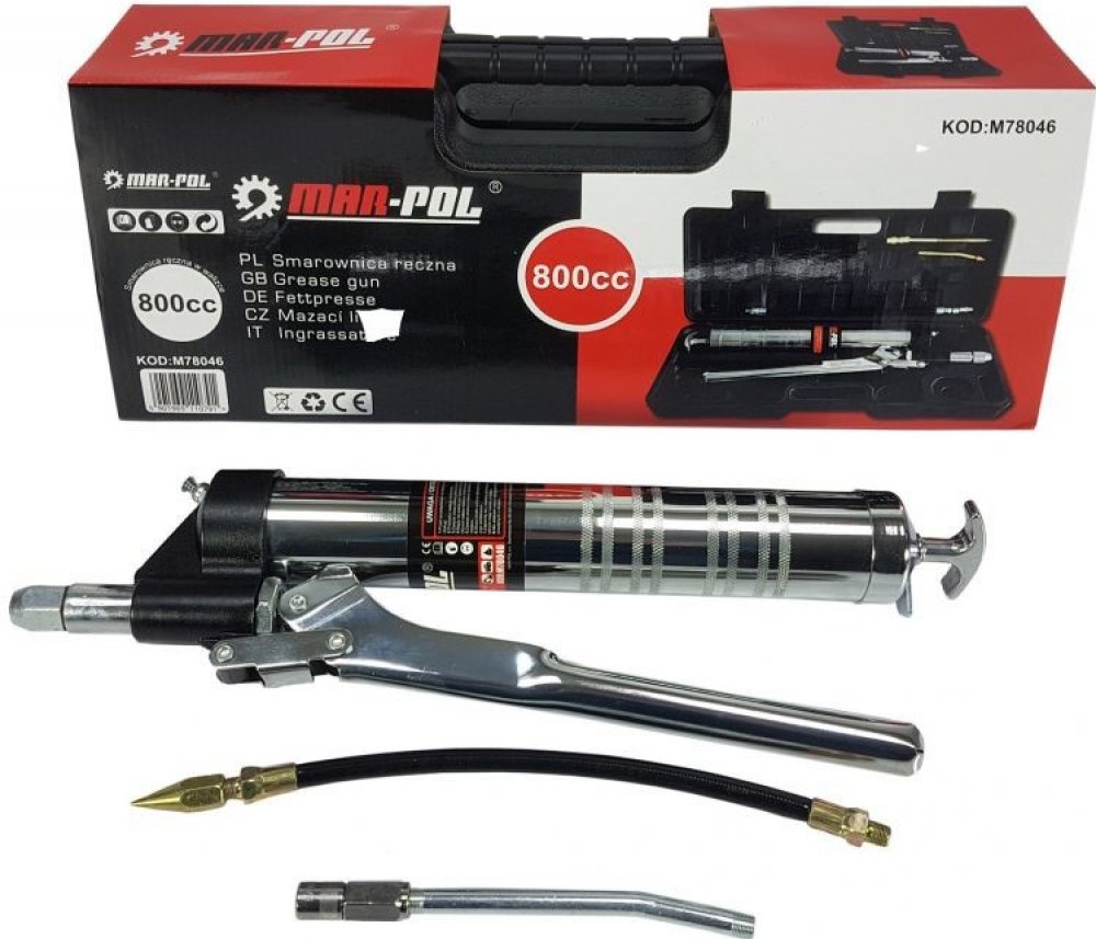 Ruční mazací lis, maznice 800ml + kufr MAR-POL Ruční mazací lis s pákou pro tlakové mazání běžnými plastickými mazivy. Ideální k mazání mechanických nástrojů a strojů. Díky speciální konstrukci páky je možná práce i ve stísněných prostorách. Lis je dodáván v plastovém kufru včetně hadic, které umožňují se dostat i do těžko přístupných míst. Specifikace kapacita: 800 cm3 (ml) vysokotlaká hadice s mazací koncovkou, délka 300 mm zahnutý kovový trubkový nástavec s mazací koncovkou, délka 150 mm plastový kufr vnitřní průměr 54 mm vnitřní délka 270 mm
