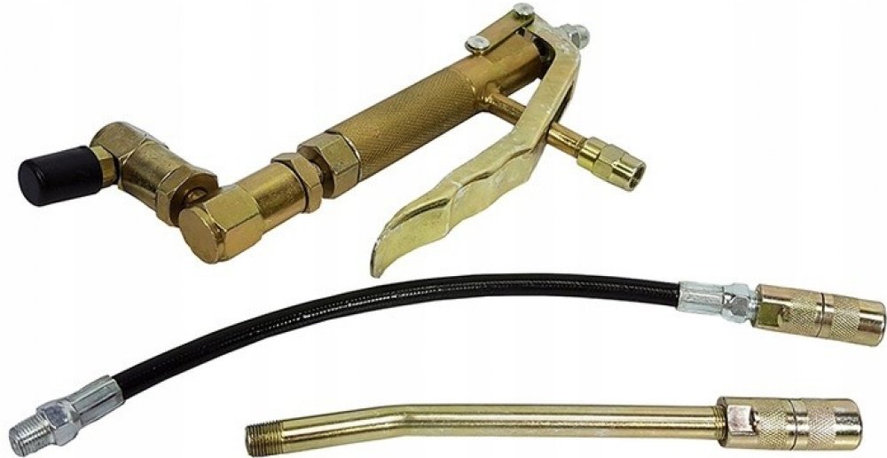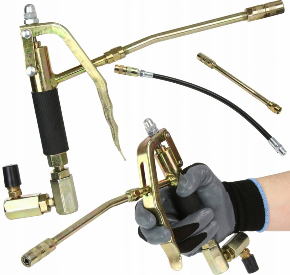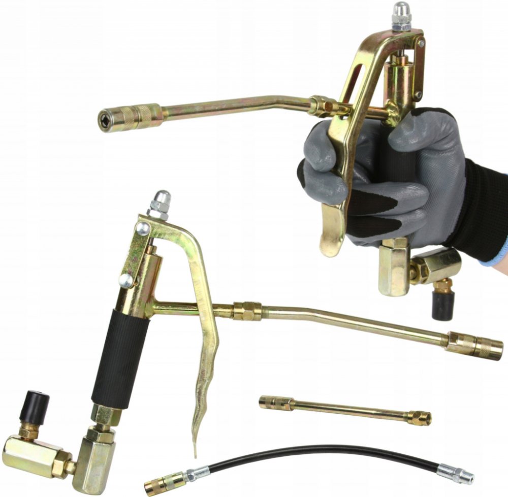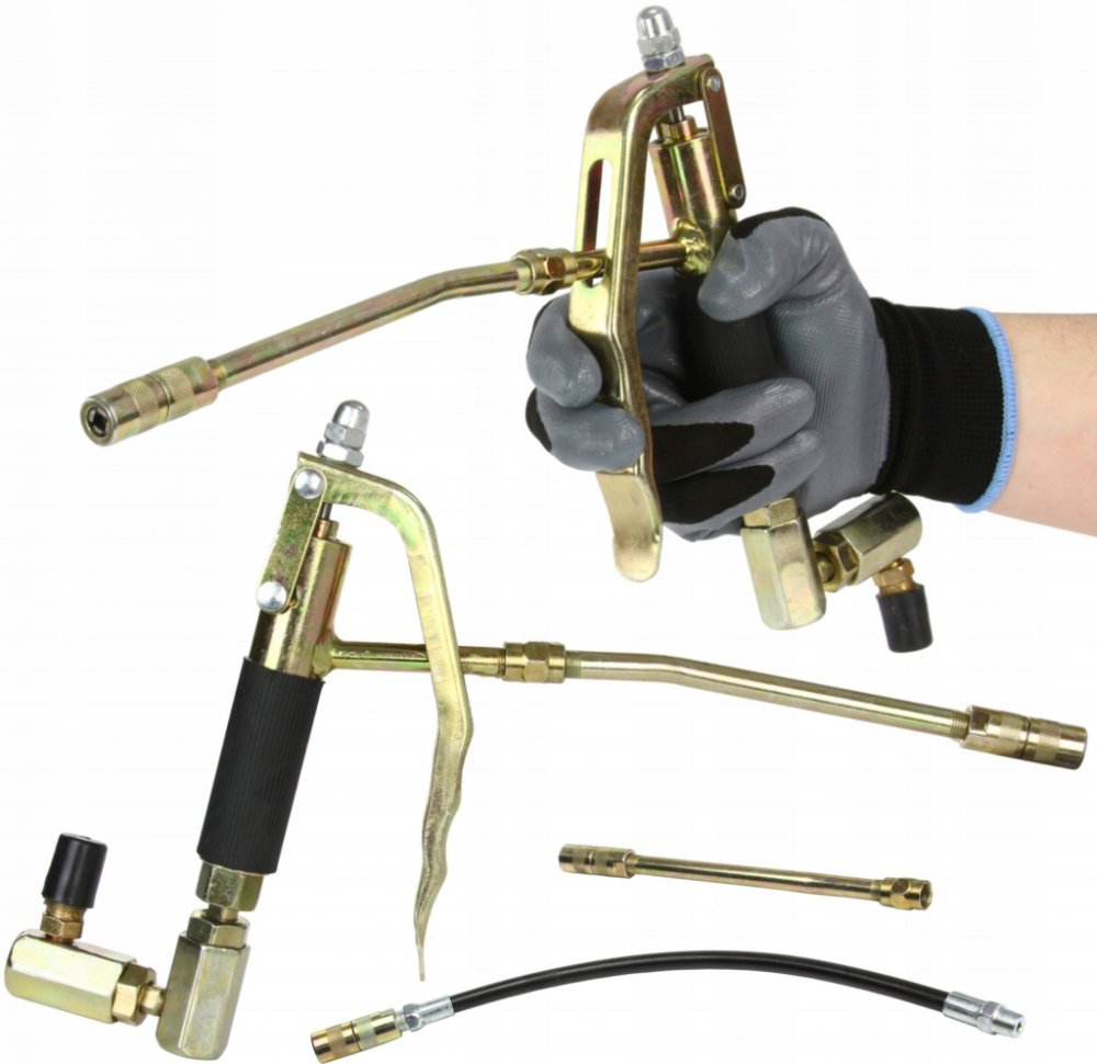 Pistole je vybavena dvěma typy mazacích nástavců. Prvním z nich je kovový nástavec, který je ideální pro aplikace vyžadující vyšší odolnost a přesnost. Druhým nástavcem je gumová hadička. Tato hadička umožňuje flexibilnější přístup k těžko dostupným místům, což je užitečné v situacích, kdy je potřeba mazat součásti nacházející se v omezených prostorech. Tato kombinace nástavců zajišťuje univerzálnost a široké možnosti použití pistole při různých úkolech údržby.