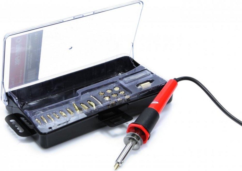 Hrotová pájka, vypalovačka do dřeva 30W s nástavci, 23 dílů Velký set pro pyrografiku. Určený pro vypalování různých dekorací - obrázků, nápisů do dřeva, kůže, vosku,korku nebo plastu. K tomuto účelu