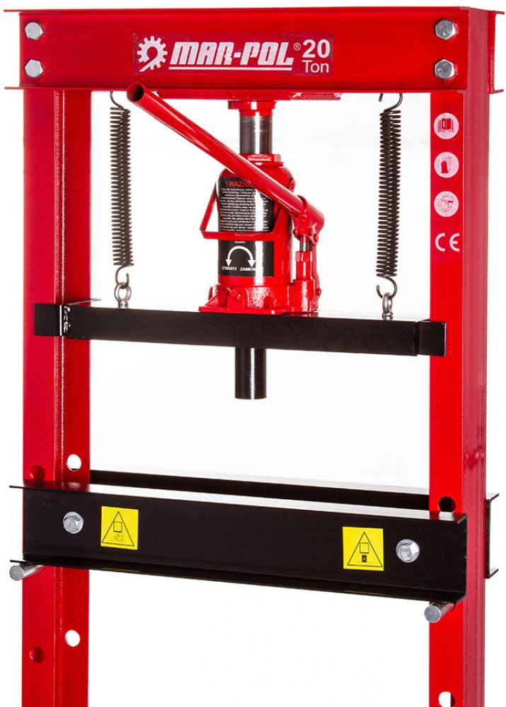 Hydraulický dílenský lis 20t MAR-POL Lis je určen pro rovnání, ohýbání, lisování, zatlačování atd. Specifikace: • lisovací síla: 20 t • provozní rozsah: 0 až 630 mm - 6 úrovní • pozměry: výška 1400 mm, základna 590 mm x 490 mm • vnitřní pracovní šířka 500 mm • průměr pracovní pístnice 38 mm • vnitřní šířka lisovací základny 100 mm • hmotnost: 50 kg • zdvih panenky: 17 cm (+ 65 mm se dá vyšroubovat na doraz)