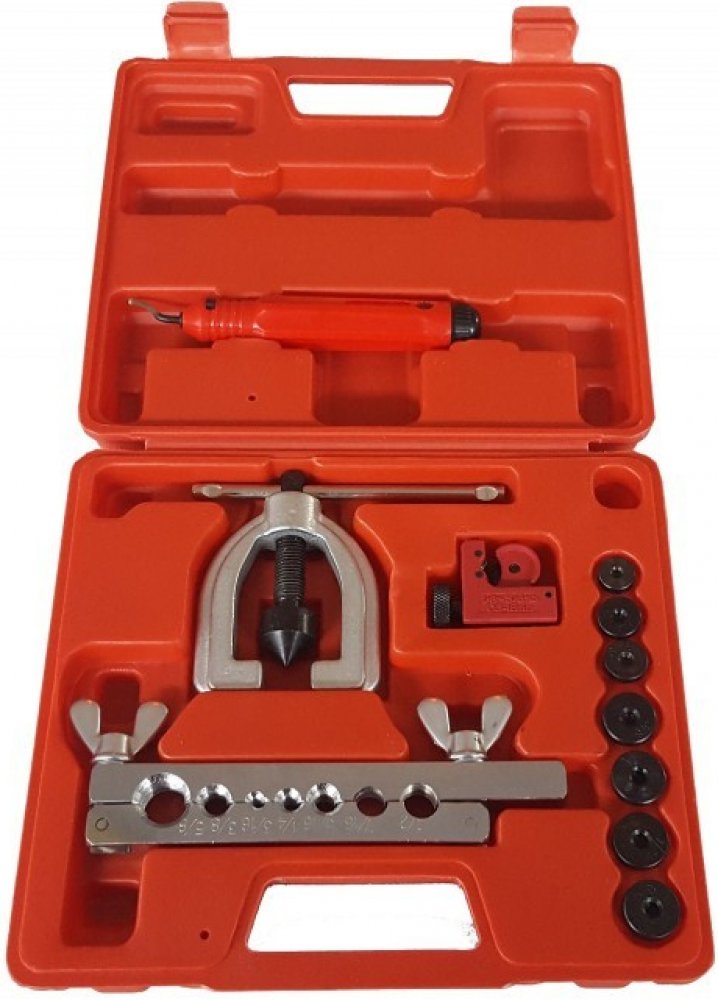 Pertlovací sada na brzdové trubky 11 ks s řezačkou Pertlovací sada na brzdové trubky se používá na běžné 90° pertlování i otevřeného ""F"" a dvojitého ""E"" na potrubí s tloušťkou stěny do 1 mm. Čelisti jsou o průměru 5-6-8-10 mm. Vhodné na meděné a hliníkové trubky.Sada obsahuje:1x základní nástroj1x upínací čelist1x řezačka1x nůž7x nástavce 3/16", 1/4", 5/16", 3/8", 7/16",1/2", 5/8"1x kufřík