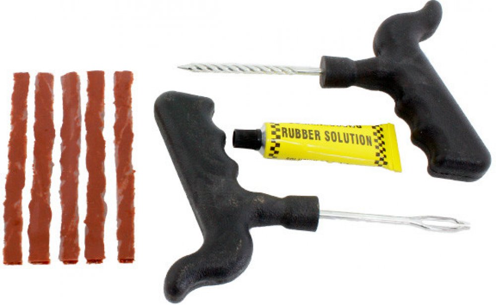Sada na opravu defektů 8 ks8-dílná sada na opravu defektů.Balení obsahuje:5x butylový pásek (200 mm)1x lepidlo / vulkanizační přípravek1x aplikátor s okem / šídlo1x vrtákNávod na použití:Označíme místo poškození pneumatiky, případně odstraníme cizí předmět.Vrtákem upravíme místo vpichu a jeho okolí. Následně na nástroj naneseme vulkanizační přípravek a aplikujeme ho do vytvořeného otvoru a na jeho okolí.Do oka aplikátoru (šídla) provlečeme butylový pásek s vulkanizačním přípravkem který následně protáhneme vytvořeným otvorem v pneumatice.Přebytečnou část pásku opatrně zřežeme nad povrchem pneumatiky.