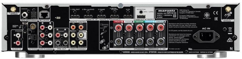 Model The NR1510 je vybaven vodorovnou řadou barevně značených, vysoce kvalitních reproduktorových svorek opatřených sadou dodávaných odpovídajících kabelových štítků pro zajištění správného zapojení. Dodávaný asistent konfigurace poskytuje zřetelné, grafické obrazovkové pokyny, zatímco průvodce rychlým uvedením do provozu zaručuje optimální nastavení pro libovolnou konfiguraci.