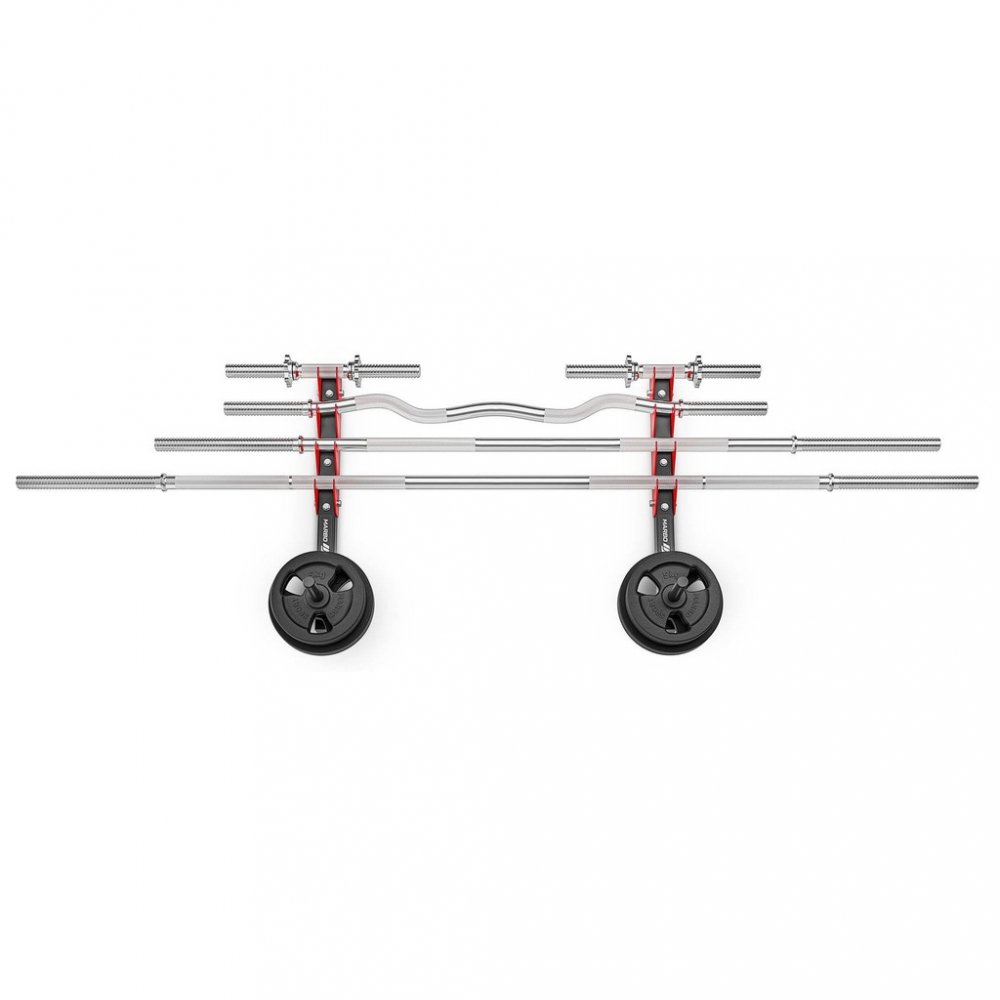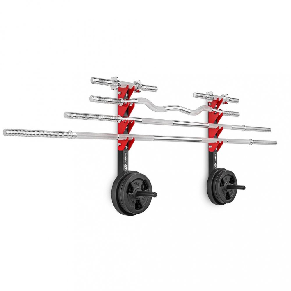 Konstrukčně jde o 2 kusy ocelových profilů určených k montáži na zeď, kdy se každý profil připevní pomocí 4 kotev. Kotvící materiál není součástí dodávky a je nutné zvolit vhodný druh podle materiálu zdi. Po montáži získáme 4 páry držáků na osy a 2 trny pro odkládání závaží. Do držáku tedy můžeme odložit až 4 obouruční osy a nebo až 8 jednoručních hřídelí. Trny pro odkládání závaží mají délku 21 centimetrů a průměr 2,5 centimetru.
