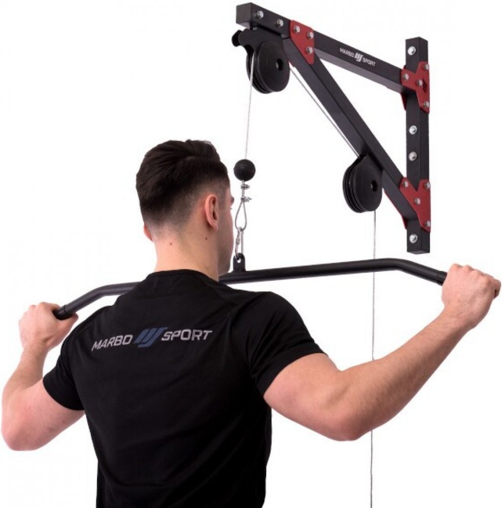Horní kladka s montáží do zdi MARBO MH-W108 2.0 je inovovaným modelem kladky MH-W108. Ve srovnání se svým předchůdcem má MH-W108 2.0 moderní design, vylepšené kladky a nakládací trn má širší, trojúhelníkovou zarážku na kotouče a je také delší.