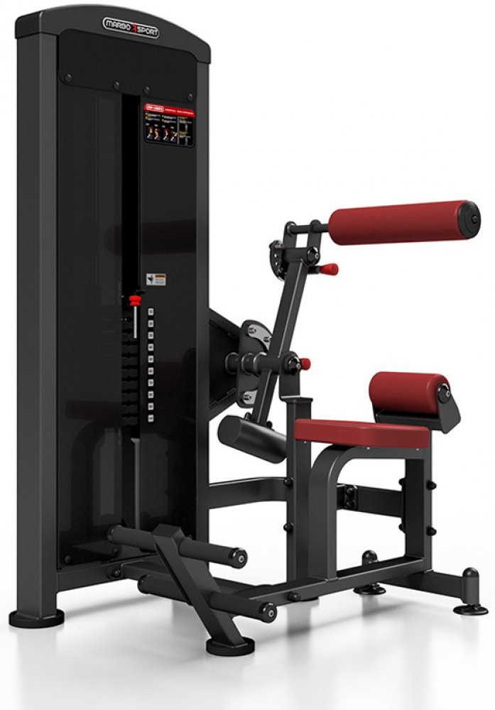 Posilovač břišních a zádových svalů MARBO MP-U220 je nekompromisní, profesionální vybavení pro Vaší posilovnu. Pro výrobu byly zvoleny ocelové profily 100x50x3mm a 80x40x3mm, které zaručují nečekanou trvanlivost. Zátěž tvoří 10ks 10kg cihel. Celková váha závaží dodávána se strojem je tedy 100kg a je možné ji rozšířit až na 160kg. Vhodné nastavení výchozí polohy ramen je velice jednoduché a intuitivní díky červeným, pneumatickým jistícím kolíkům. Hlavní rameno má 6 poloh a válec má 8 poloh nastavení. Napínaní lanek se provádí regulací 4 šroubů na hlavním vodícím kole. Odpadá tak složité rozebírání stroje. Polstrovaní je ze syntetické kůže sešité režnou nití značky COATS vyplněné tvrdou pěnou, to celé ja na 3mm hrubé, ocelové desce. Tichý chod zajištuje zakrytování černým plastem, z přední části je kryt opatřen průhledem pro snadné nastavení požadovaného počtu cihel. Stroj je navíc opatřen velikou samolepkou, která instruuje cvičence, jaké cviky jdou na stroji provádět a které skupiny svalů daný cvik posiluje.