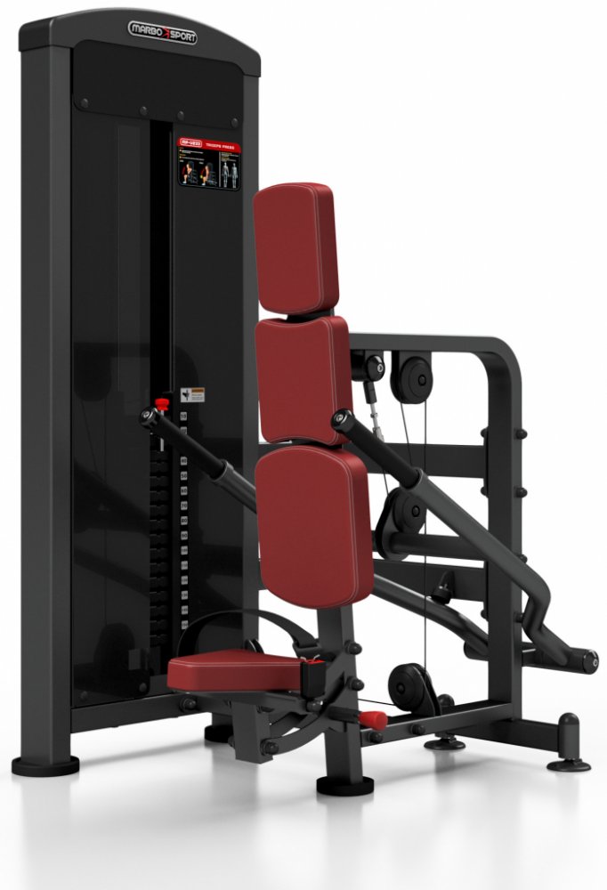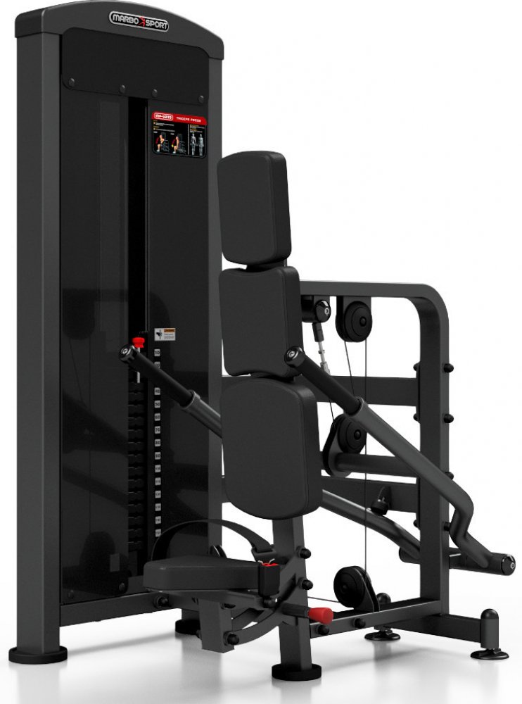 Posilovací stroj – triceps se závažím Marbo Sport MP-U233 je profesionální náčiní pro vypracování tricepsů pomocí dipů vsedě. Maximální stabilitu během tréninku zajišťuje robustní rám s protiskluzovými podložkami základny. Jelikož při práci s vyšší zátěží je důležité zůstat v té správné poloze, sedadlo je vybavené bezpečnostním pásem, který udrží spodní polovinu vašeho těla na místě. Výška sedadla je nastavitelná tak, aby si ji uživatel mohl přizpůsobit velikosti vlastní postavy. Kvalitní polstrování ze syntetické kůže je pevné a zároveň velmi pohodlné a poskytne tak skvělou oporu při cvičení. Nastavitelné závaží je odhlučněno plastovým krytem, takže práce na přístroji probíhá v klidu a relativní tichosti. Závaží lze navíc nastavit v rozmezí 10-160 kg, takže jej využijí začátečníci i pokročilí jedinci. Posilovací stroj Marbo Sport MP-U233 nabízí kvalitní trénink se zaměřením přímo na triceps a je tak důležitým vybavením pro každou kvalitní posilovnu.
