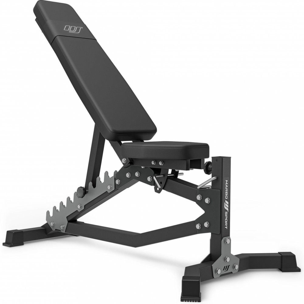 Variabilní, posilovací lavice MARBO Sport MS-L102 ve verzi 2.0 je dovedena téměř k dokonalosti. Rám je vyroben na precizních CNC strojích z ocelových profilů o rozměru 50 x 50 x 2 milimetry, tento postup výroby zaručuje vysokou přesnost, stabilitu a nosnost výsledné konstrukce. Laserem vypalované profily zarážek umožňují opravdu precizní nastavení zádové opěry do 10-ti poloh, tato jemná regulace umožňuje přizpůsobení posedu opravdu kterémukoliv cviku. Sedák lze nastavit do 3 poloh a jeho regulace se provádí pomocí čepu. Variabilita nastavení je v rozsahu od téměř 90-ti stupňové "židle" až po šikmou lavici s úhlem -21°. Lavici MS-L102 2.0 lze v kombinace se stojanem pod velkou činku použít také k silovému tréninku, nosnost lavice je 300 kilogramů. Polstrování je opatřeno dvojitými švy pro maximální pevnost. V nejnamáhanějším místě je zádová opěra opatřena druhou vrstvou kůže s logem MARBO Sport. Koncovky stabilizátorů jsou vyrobeny ze speciální směsi gumy, která zajišťuje ještě lepší stabilitu a ochranu podlahy než u předchozí generace lavic.