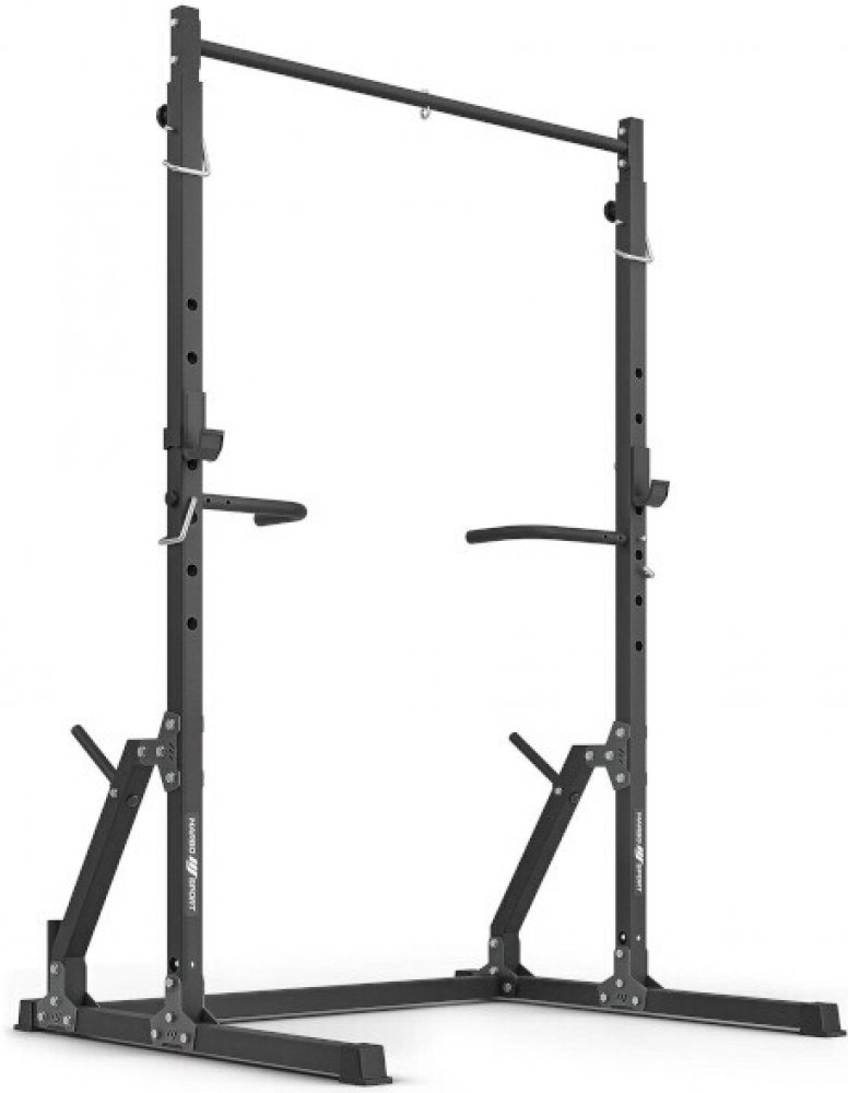 Součástí dodávky jsou 2 ocelové háky pro odložení obouruční činky. Háky lze nastavit do 7-mi úrovní v rozsahu od 72 do 132 cm. Háky mají čep, který se zasune do otvoru v požadované výšce a následně se hák otočí, tím dojde k jeho zajištění. Díky gravitaci zůstane hák pevně na svém místě, takže se nemusíte bát o bezpečnost ani během tréninku s velice těžkou činkou. Výškový rozsah háků je ideální pro trénink s lavičkou. Konstrukce je kompatibilní s obouruční činkou, která má úchopovou část delší než 123 centimetrů.