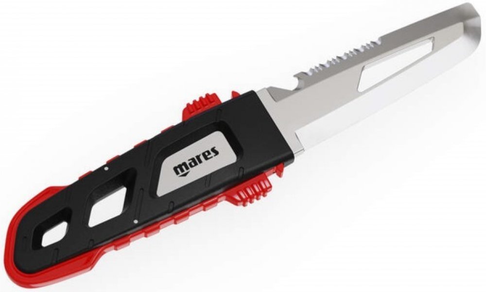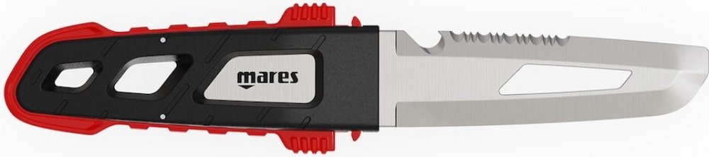 Potápěčský nůž Mares MC-100 je kvalitní ocelový nůž s délkou čepele 70 mm, rovnou i vroubkovanou čepelí, řezákem šňůr a plochou špičkou.
