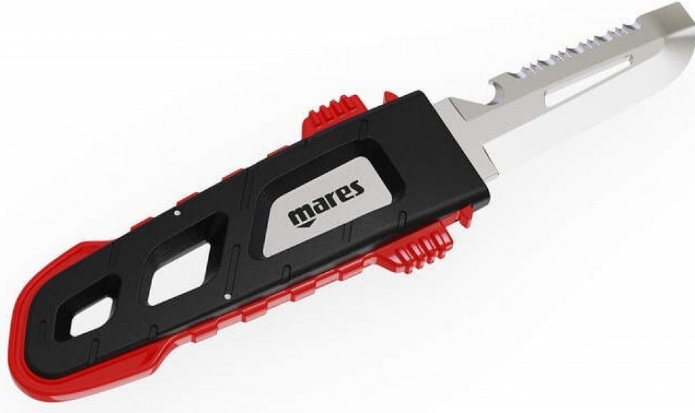 Součástí nože je plastové pouzdro. Nůž na potápění můžete snadno upevnit na Mares BCD díky průchodkám.