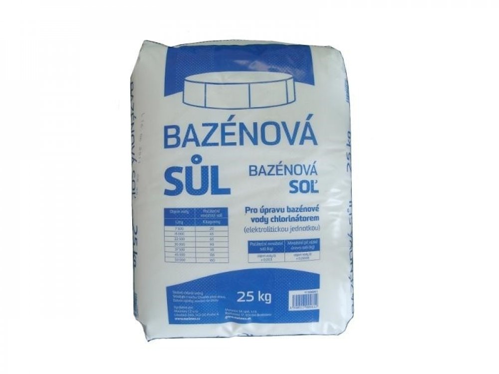 Sůl bazénová Bazénová sůl je vhodná pro solinátory (chlorinátory). Rozpusťte optimální množství soli v nádobě a roztok následně vylijte přímo do bazénu. Sůl se sype přímo do bazénu. Aby se stačila řádně rozpustit, doporučuje se sypat sůl postupně. Solinátor bude tak v pořádku fungovat. Pro přípravu ideální koncentrace se řiďte instrukcemi přiloženými k Vašemu solinátoru. Se slanou vodou v bazénu si vychutnáte koupání v moři přímo na zahradě. Bazénová sůl se získává z nejhlubších míst německých solných dolů, což jí dává optimální vlastnosti. Sůl neobsahuje hrubé nečistoty, je jemně mletá a snadno se ve vodě rozpouští. Doporučené množství soli: 25 kg = 8 000 l (8m3) 3 kg soli = 1 000 l (1m3) Lze použít mořskou sůl bez solinátoru? Sůl může být použita bez solinátoru. Nicméně nebude plnit funkci desinfekci bazénu. Solí se získá pouze slaná voda. Typická slanost vody mořské vody je 20 - 40 g/ litr a dle toho lze dávkovat sůl. Současně lze použít dle potřeby proti řasám přípravek ChlorShock. Technické parametry: Hmotnost: 25 kg
