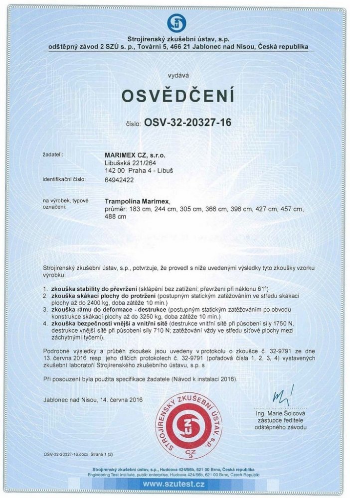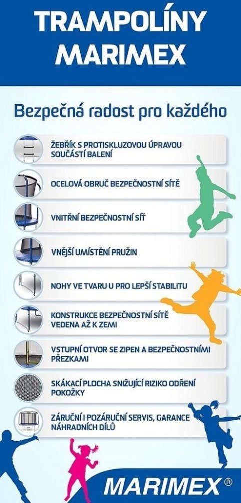 Trampolína Marimex je skvělým doplňkem každé zahrady. Děti skákání na trampolíně milují -nosnost je až 50 kg. Dokonalou stabilitu zajišťují tři nohy ve tvaru písmene U. Materiál odrazové plochy patří k nejkvalitnějším na trhu. Plocha je vyrobena ze speciálního polypropylenu s ochranou proti UV záření, který zaručuje dlouhou životnost. Speciální neabrazivní (hladká) povrchová úprava zabrání odření ...