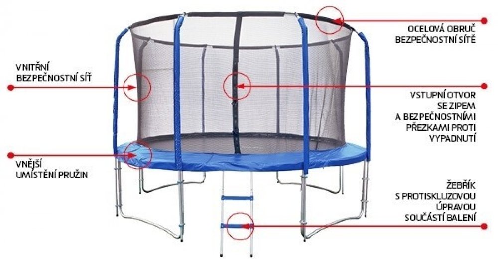 druh trampolíny: nadzemníprovedení: pružinovápočet pružin: 48počet tyčí: 6ochranná síť: anospodní ochranná síť: nežebřík: anodélka montáže: cca 45 minutmaximální šířka trampolíny včetně tyčí ochranné sítě: 250 cmminimální průměr plochy pro umístění trampolíny doporučený výrobcem: 400 cmcelková výška trampolíny včetně ochranné sítě v nejvyšším bodě: 218 cmObsah balení:1 x trampolína1 x ochranná síť1 x žebříkrozměry balení: 132 x 44 x 26 cmhmotnost: 42 kg