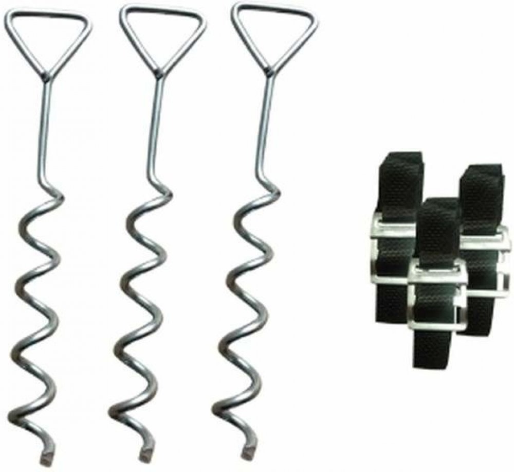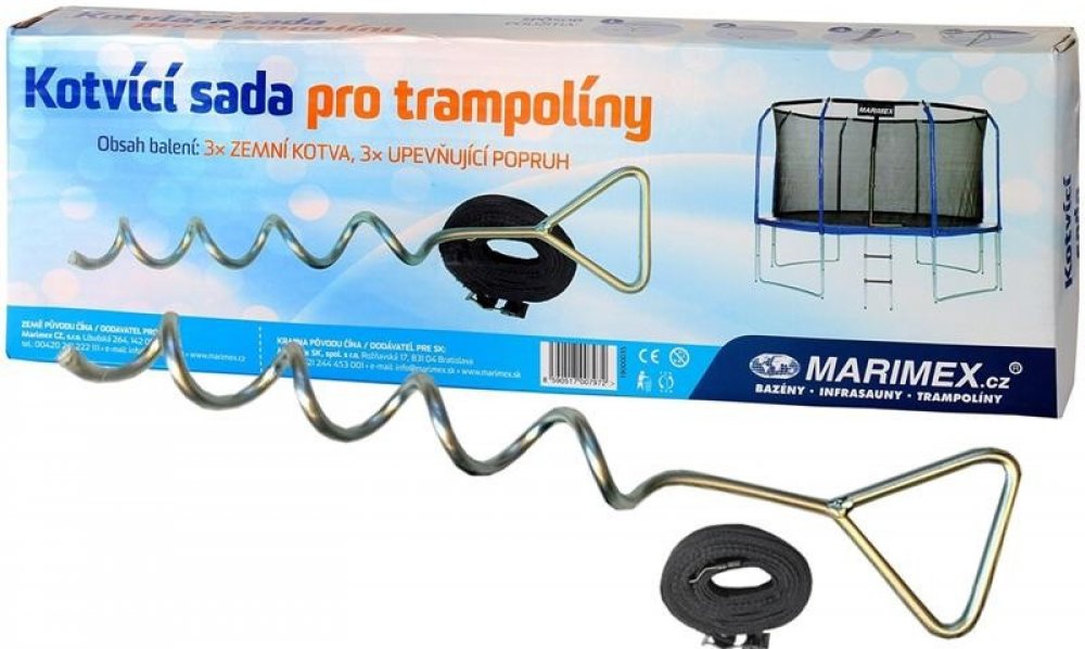 S kotvicí sadou je možné rychle a jednoduše připevnit trampolínu k zemi a zajistit tak její dokonalou stabilitu. Sada se skládá ze spojovacích pásů s ocelovými přezkami a bodáků s protihrotem. Po zajištění kotvicí sadou zamezíte pohybu i při silnějším větru. Sadu je možné použít ke zpevnění všech typů trampolín Marimex. Je nutné ji upevnit do zpevněného podkladu.