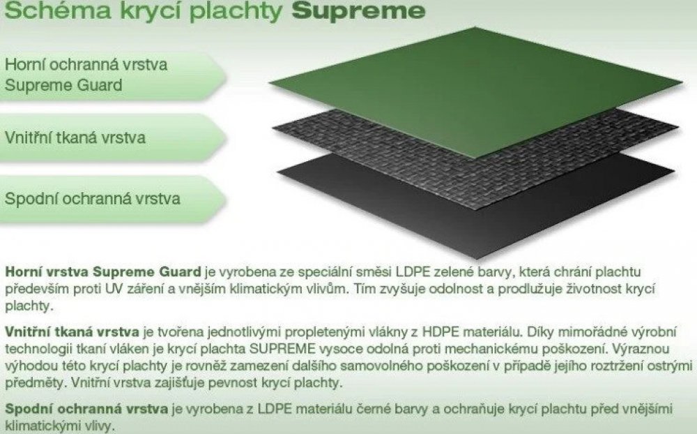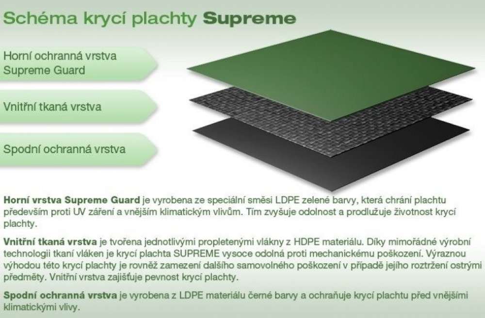 * Díky použití ochranné vrstvy Supreme Guard je krycí plachta Supreme pevnější a lépe odolává povětrnostním vlivům – nejedná se ale o zimní plachtu a používání při teplotách pod bodem mrazu životnost krycí plachty snižuje.