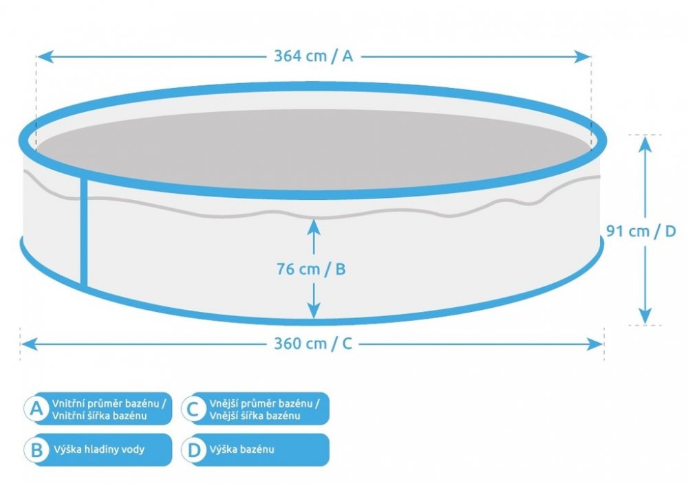 Ø 366 x 91 cm 0.25 mm 80 cm kruhové nadzemní i zapuštěné 8000 l Marimex ocelové ocelové a plechové stěny samostatný bazén s náročnou instalací trvalá instalace modré na středně velkou zahradu
