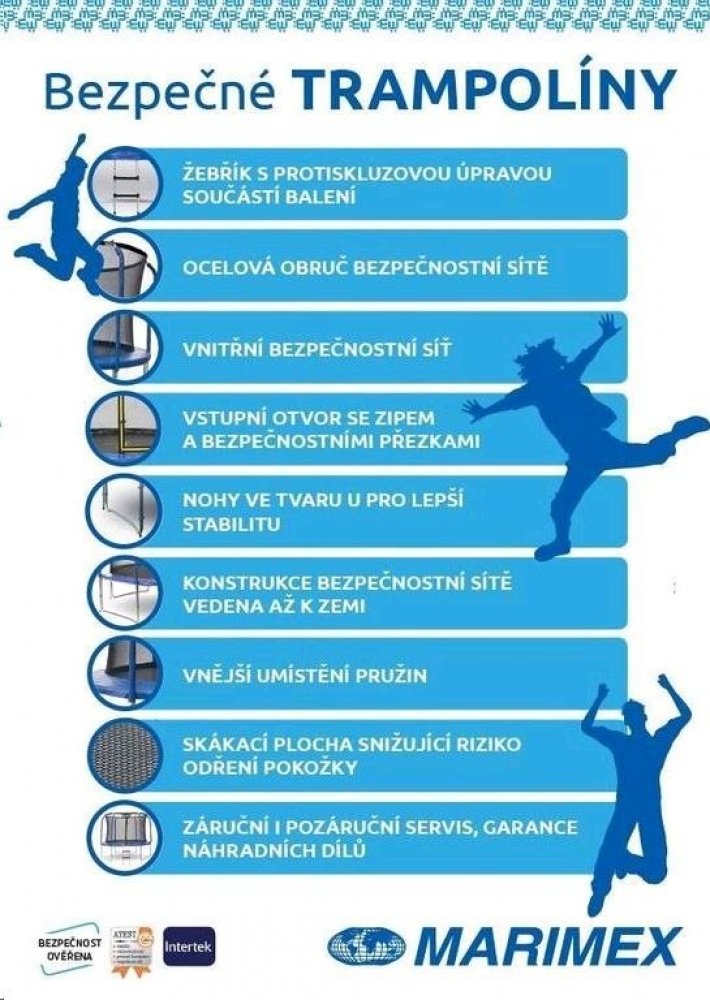 Trampolíny Marimex Premium vynikají zejména unikátním designem a barevností, ale také ještě větší stabilitou, pevností a bezpečností. Zvýšené stability trampolín Marimex Premium je dosaženo pomocí vyššího počtu nohou. Bezpečnost zajišťují zesílené ochranné kryty pružin a nová technologie T-spojů. Vnitřní ochrannou síť podpírá osm dynamicky prohnutých tyčí a napnutou ji drží zpevněná horní obruč. Skákací plocha je vyrobena z velmi odolného a neabrazivního materiálu s vysokou životností. Na bezpečnostní prvky trampolín Marimex Premium je kladen velký důraz, proto jsou řazeny mezi nejbezpečnější a nejspolehlivější na českém trhu.