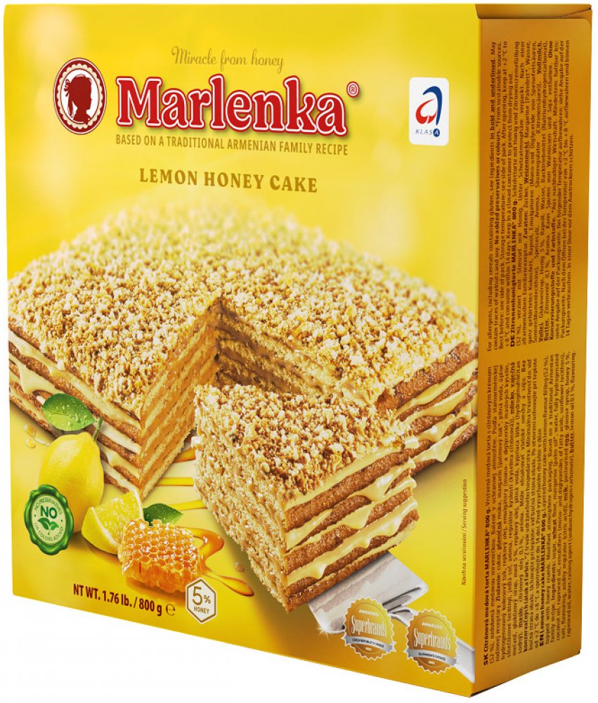 Medový dort MARLENKA® je vyráběn podle rodinné staroarménské receptury a dnes je již legendou. Na jeho výrobu se používají ty nejkvalitnější suroviny bez použití konzervačních látek a barviv. Charakteristickou a originální chuť tvoří především nadýchané medové těsto, lahodný karamelový krém a osvěžující chuť zralých citrónů. Produkt je rovněž bez GMO. Pro svou výjimečnou kvalitu byl oceněn značkou...