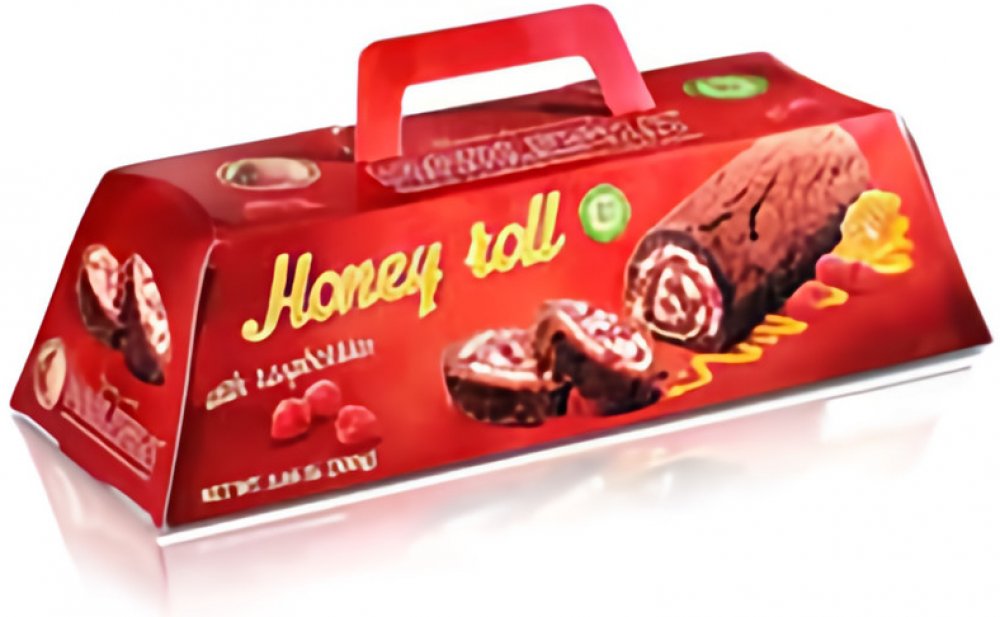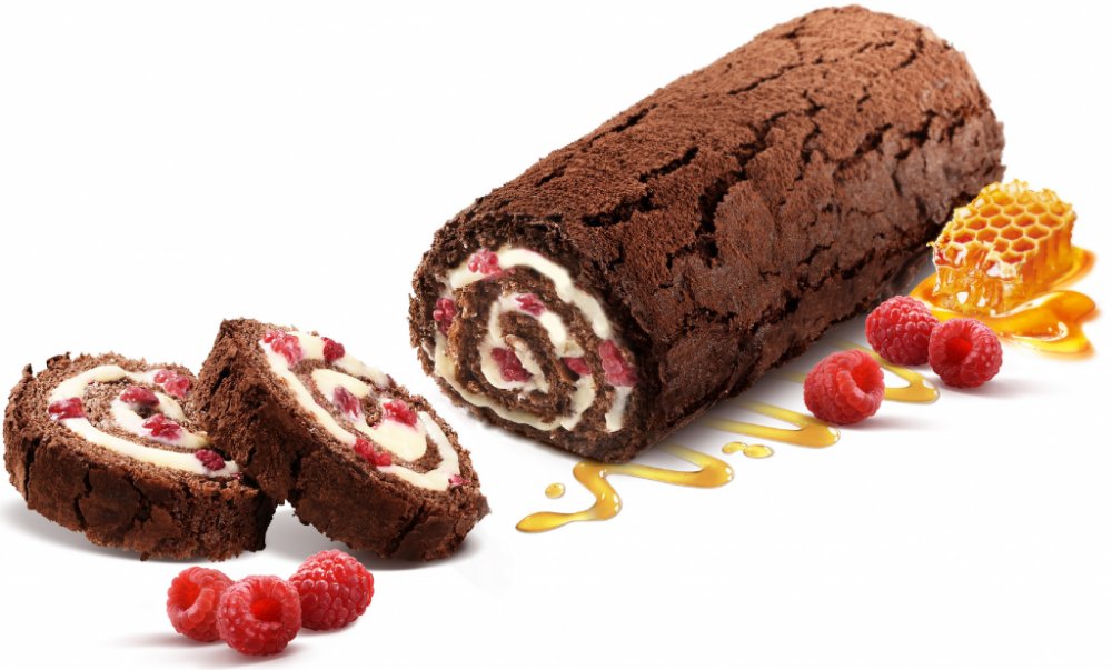 Medová kakaová roláda plněná malinovým krémem, zdobená malinami a kakaem. Cukrářský výrobek s náplní lehkou tukovou (59 %).