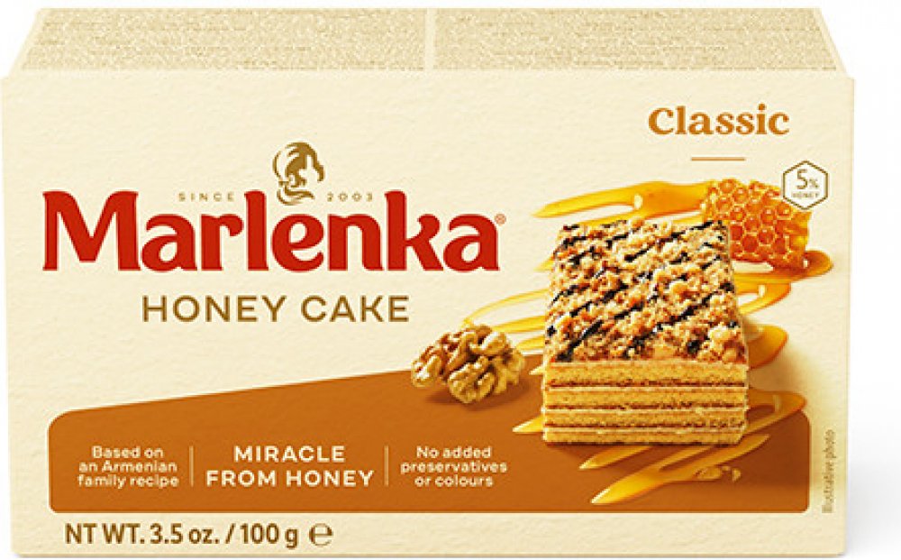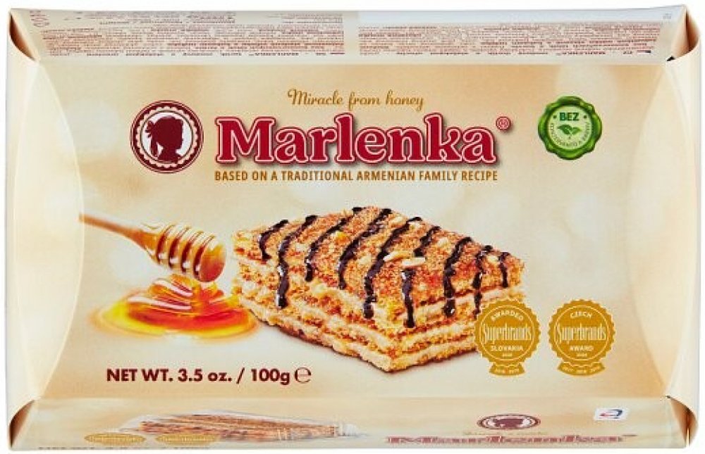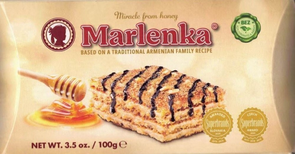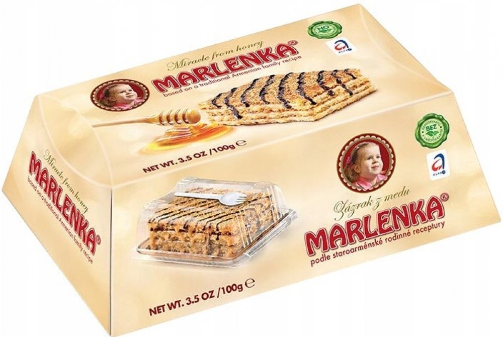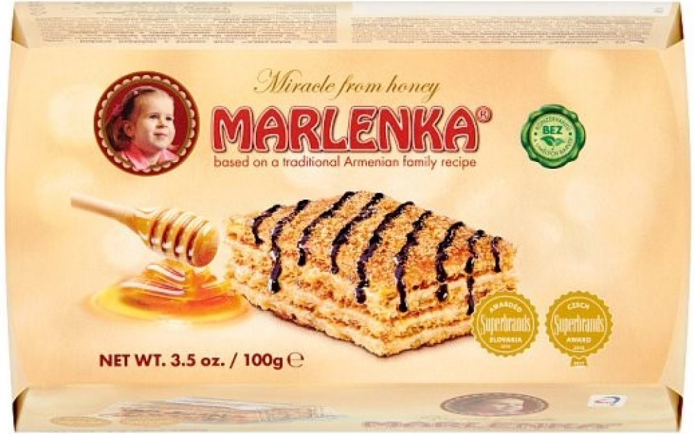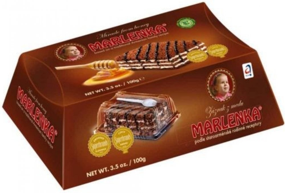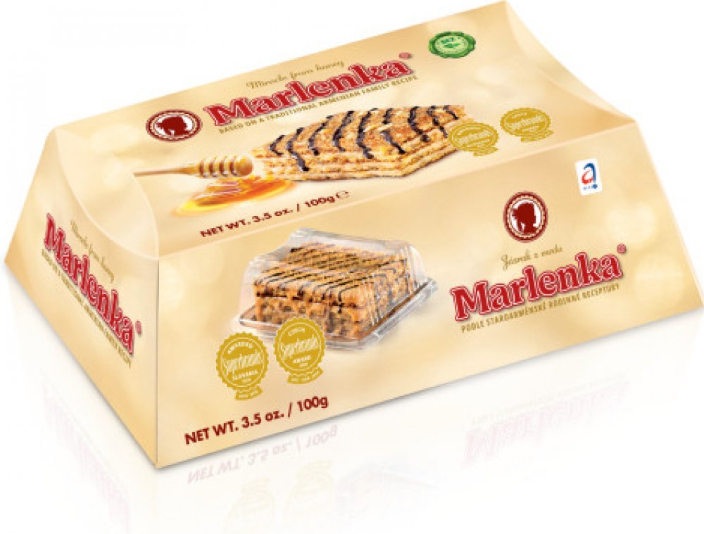 Medový dortík MARLENKA® je zmenšenou verzí klasického medového dortu, jehož receptura vychází z rodinné staroarménské tradice. Na jeho výrobu se používají ty nejkvalitnější suroviny bez konzervačních látek a barviv. Originální chuť tvoří především nadýchané medové těsto, lahodný karamelový krém a kousky vlašských ořechů.Pro jeho výjimečnou kvalitu a také mimořádnou trvanlivost mu byla Ministerstve...