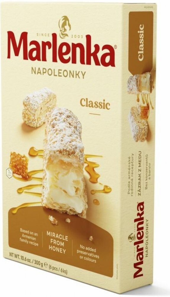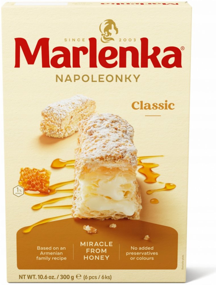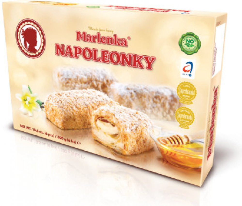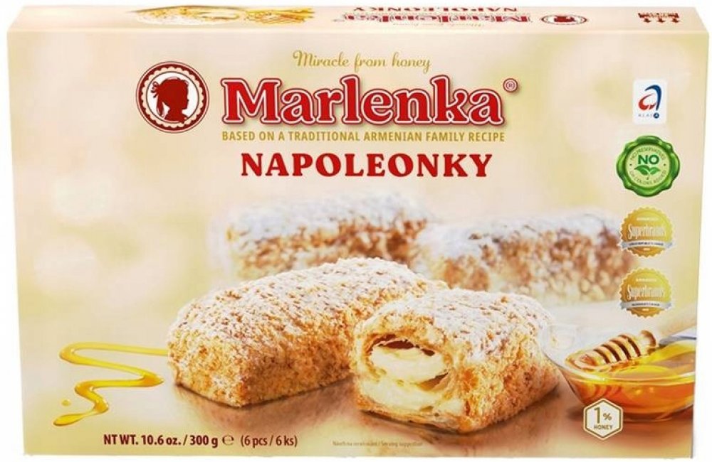 Nadýchaný, křehký zákusek s lahodným krémem, který nechybí na žádné tradiční arménské oslavě. NAPOLEONKY jsou vyráběny podle staroarménské rodinné receptury z těch nejkvalitnějších surovin bez použití konzervačních látek a syntetických barviv. Produkt je rovněž bez GMO.