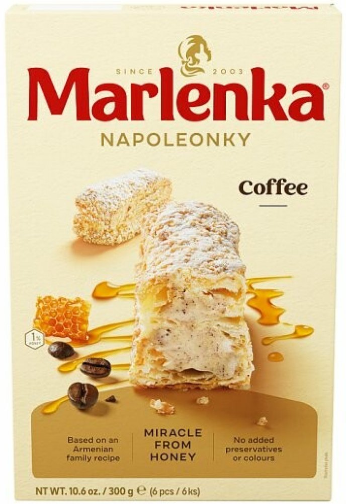 -- Marlenka Napoleónky kávové 300 gNapoleonky jsou tradiční arménský zákusek z listového těsta. Nadýchané, křehké a plné lahodného krému nesmí chybět na žádné tradiční arménské oslavě. Napoleonky jsou z těch nejkvalitnějších surovin bez použití…