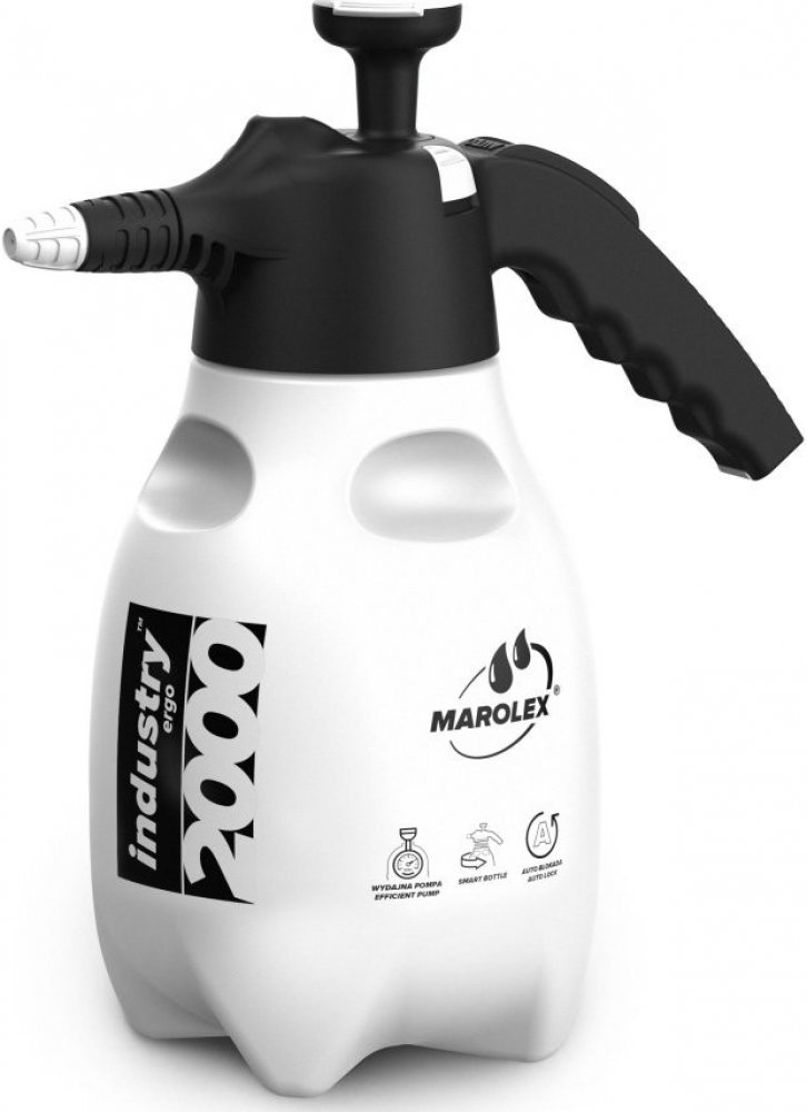 Postřikovač Marolex Industry ergo acid 2000 o objedmu 2l je vybaven náhradní tryskou, která je umístěna v horní části postřikovače. Trysky mají možnost nastavitelnosti úhlu proudění a průtoku kapaliny. Díky ergonomicky tvarované rukojeti a oválnému tvaru je pohodlný pro manipulaci. Nádoba postřikovače je poloprůhledná se stupnicí pro lepší kontrolu množství kapaliny. Postřikovače Industry se vyznačují vysokou životností, jsou odolné proti postřikům na alkalické bází díky EPDM těsnění a odolnému materiálu nádoby a dalších komponentů. Tlak - 0,4 MPa