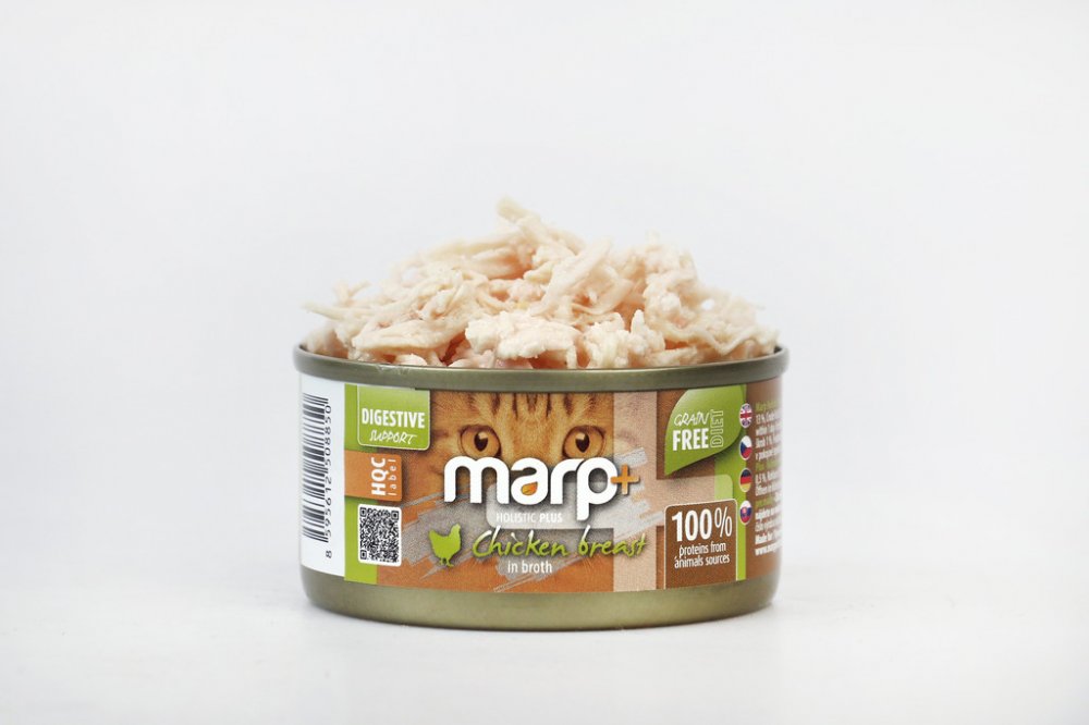 Kousky kuřecích prsou v lahodném vývaru – žádné vnitřnosti, žádné umělé doplňkové látky, žádné obiloviny – to jsou špičkové konzervy Marp Holistic Plus pro kočky. Respektujeme kočku jako masožravce, a proto pochází 100 % bílkovin ze živočišných zdrojů. Složení jsme obohatili o fruktooligosacharidy na podporu zažívání. Toto krmivo bude vaše kočka skutečně zbožňovat.