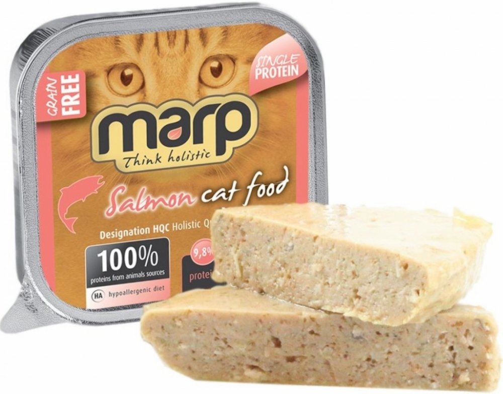 Vaničky Marp Pure obsahují 100% bílkovin ze živočišných zdrojů. Obsahují pouze maso, vnitřnosti, vývar a minerály. Při výrobě se nepoužívají žádné umělé konzervanty, barviva, plnidla apod. a jsou vždy bez jakýchkoliv obilovin. Vanička Marp s lososem bez obilovin je vhodná i pro kočky s citlivým zažíváním a dle našich zkušeností je velmi vhodná i pro kočky s potravními alergiemi.