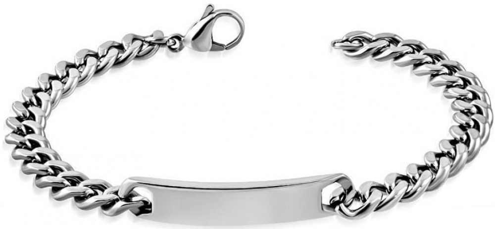 Náramek chirurgická ocel lesklá. S lesklou destičkou uprostřed.Délka 21 cm. Šířka 7 mm.Do náramku je možné gravírovat text. Vaši představu o gravírování náramku popište v 2. kroku objednávky nebo váš návrh připojte v souboru před odesláním. Pro text lze použít jakýkoliv font z Windows sady.