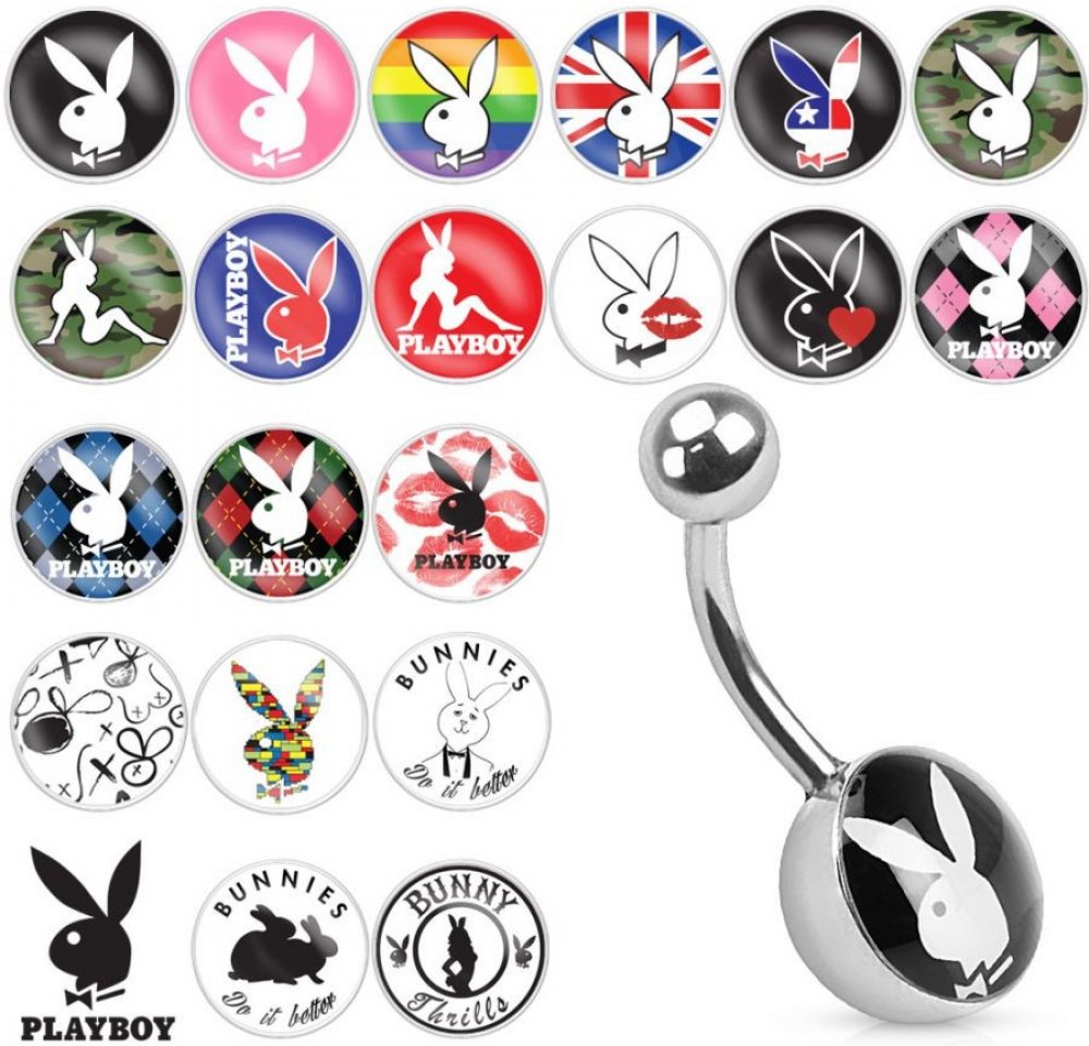 Piercing banánek do pupíku s obrázkem Playboy.Tyčinka a kuličky piercingu jsou vyrobeny z chirurgické oceli.Rozměr piercingu: 1,6 x10 x 10/5.Piercing je na výběr z motivů dle fotky:1) Bílý playboy na černém podkladu2) Bílý playboy na růžovém podkladu3) Bílý playboy na duhovém podkladu4) Bílý playboy na anglické vlajce5) Playboy z anlické vlajky na černém podkladu6) Bílý playboy na maskáčovém podkl...