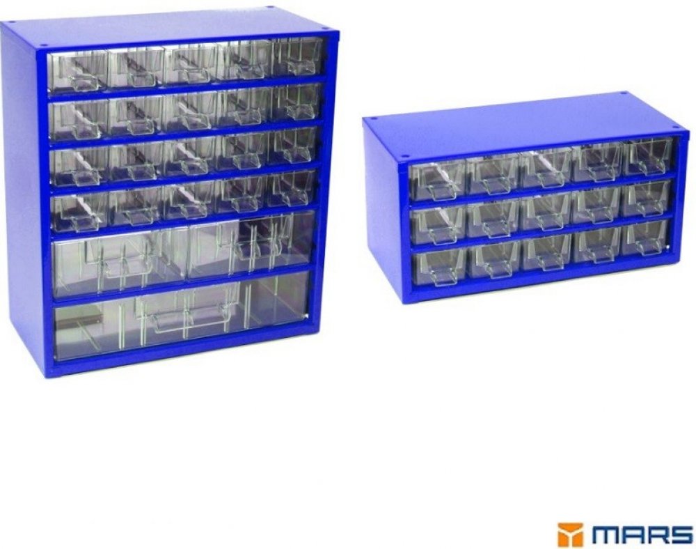 - Kvalitní a odolné skříňky Mars, které nesmí chybět ani ve Vaší dílně, jsou vyrobeny z ocelového plechu a opatřeny odolným práškovým lakem. Čiré zásuvky a přepážky jsou vyrobené z trvanlivého materiálu PS(polystyrol).