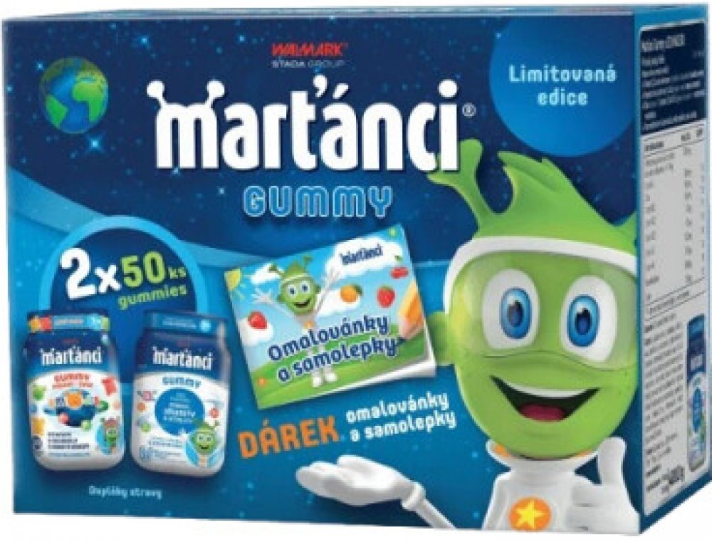 Dárkové balení Marťánků s omalovánkami a samolepkami. V tomto speciálním balení najdete doplňky stravy Marťánci Gummy s echinaceou, Marťánci Gummy s rakytníkem a zábavné omalovánky a barevné samolepky – pro radost i tvořivou zábavu.Marťánci Gummy s echinaceou obsahují extrakt z Echinacea purpurea (třapatka nachová), tradičně používanou bylinu.Vitamin C, D3, zinek a echinacea přispívají ke správné funkci imunitního systému.Vitamin C, E a zinek jsou antioxidanty chránící buňky před oxidačním stresem.Kyselina listová a vitaminy C a B3 přispívají ke snížení únavy a vyčerpání.Biotin (vitamin B7), vitamin C, B3 a B12 přispívají ke správnému energetickému metabolismu.Balení obsahuje 50 ks.Marťánci Gummy s rakytníkem: Podpora zdraví a imunity:Vitamin C, D3, zinek a rakytník přispívají ke správné funkci imunitního systému. Rakytník podporuje správné trávení.Kyselina listová a vitamin C přispívají ke snížení únavy a vyčerpání.Vitamin C přispívá ke správnému energetickému metabolismu.Výtečná příchuť marakuji, malin, jahod a pomeranče.Balení obsahuje 50 ks.