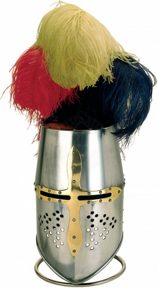 Hrncová přilba Templář Ručně vyráběná templářská helma v reálné velikosti. Mosazný templářský kříž. Výška cca 35cm Hrncová přilba byla často černěná, lakovaná nebo malovaná a často nesla dekorace jako: Větrací dekorace (kříže a symboly) Dekorace hledí (horizontální a vertikální „kříž“) Zdobné klenoty, jako jsou koruny, peří, klobouky, křídla, lvi atd. Vysoce kvalitní přilba templářského brnění z exkluzivní kolekce "Historic Armours" od MARTO® Dodávka včetně certifikátu kvality a původu. Vyrobeno ve španělském Toledu. Ve své nejjednodušší podobě byla Hrncová přilba plochým ocelovým válcem, který zcela zakrýval hlavu a měl jen velmi malé otvory pro oči a ústa. Pozdější varianta s více kuželovitou špičkou je známá jako helma „cukrová homole“. Ve španělštině se jim říká Yelmo de Zaragoza, což je odkaz na Zaragozu, kde byli poprvé tyto helmy představeny na Pyrenejském poloostrově. Přestože Hrncová přilba nabízela mnohem lepší ochranu než předchozí přilby, jako je přilba s nánosníkem a přilba sponková, omezovala periferní vidění nositele a sériově vyráběná forma (s plochým vrchem bez větracích otvorů) byla nejen těžká, ale také nabízel malou ventilaci a v horkém počasí se mohl rychle přehřát. Rytíři obvykle nosili hrncovou přilbu přes kuklou (kápi), někdy ve spojení s přiléhavou železnou lebkou.